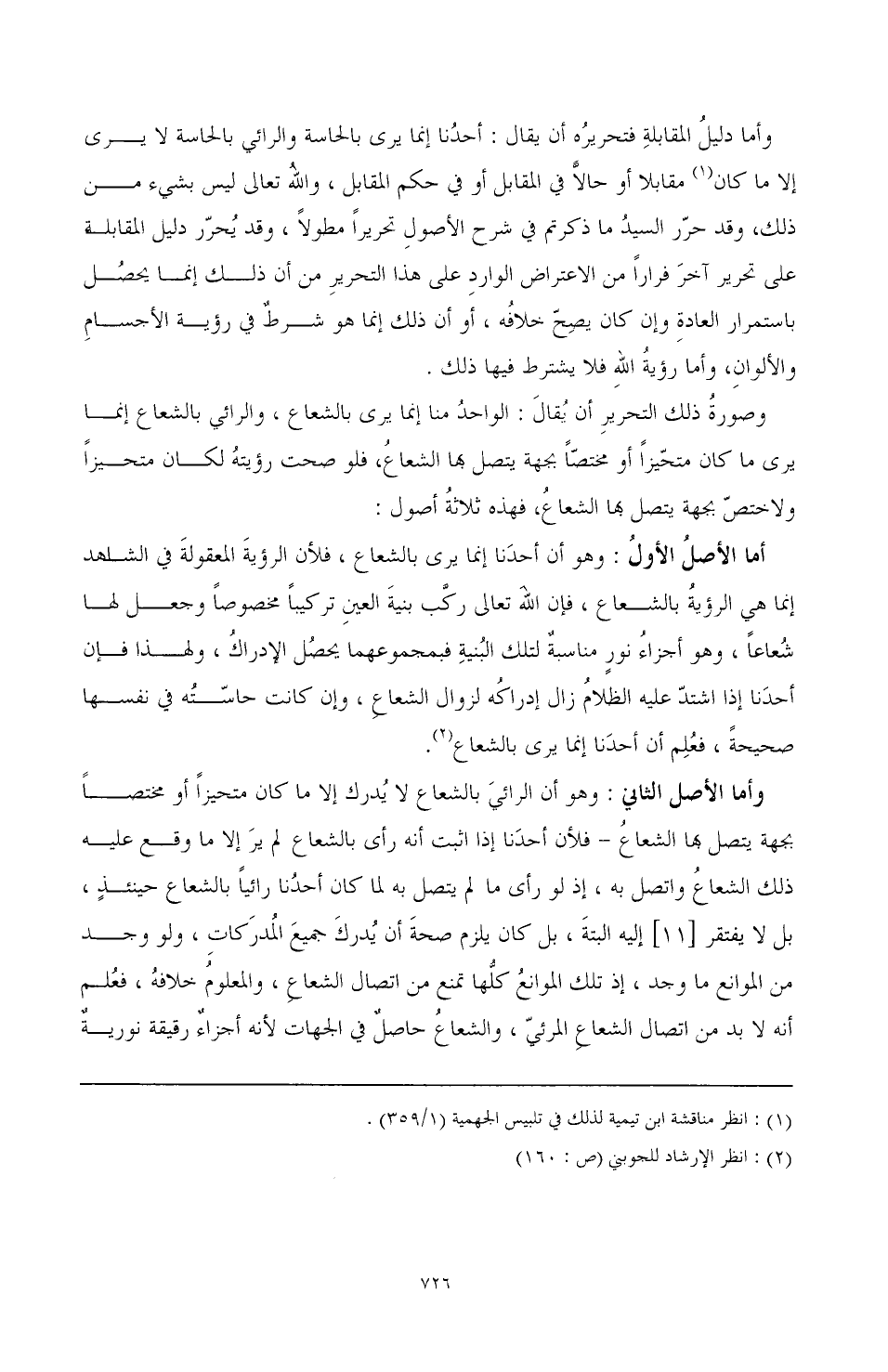 وأما الأصل الثاني: وهو أن الرائي بالشعاع لا يدرك إلا ما كان متحيزا أو مختصا بجهة يتصل الشعاع- فلأن أحدنا إذا اثبت أنه رأى بالشعاع لم ير إلا ما وقع عليه ذلك الشعاع واتصل به، إذ لو رأى ما لم يتصل به لما كان أحدنا رائيا بالشعاع حينئذ، بل لا يفتقر إليه البتة، بل كان يلزم صحة أن يدرك جميع المدركات، ولو وجد من الموانع ما وجد، إذ تلك الموانع كلها تمنع من اتصال الشعاع، والمعلوم خلافه، فعلم أنه لا بد من اتصال الشعاع المرئي، والشعاع حاصل في الجهات لأنه أجزاء رقيقة نورية