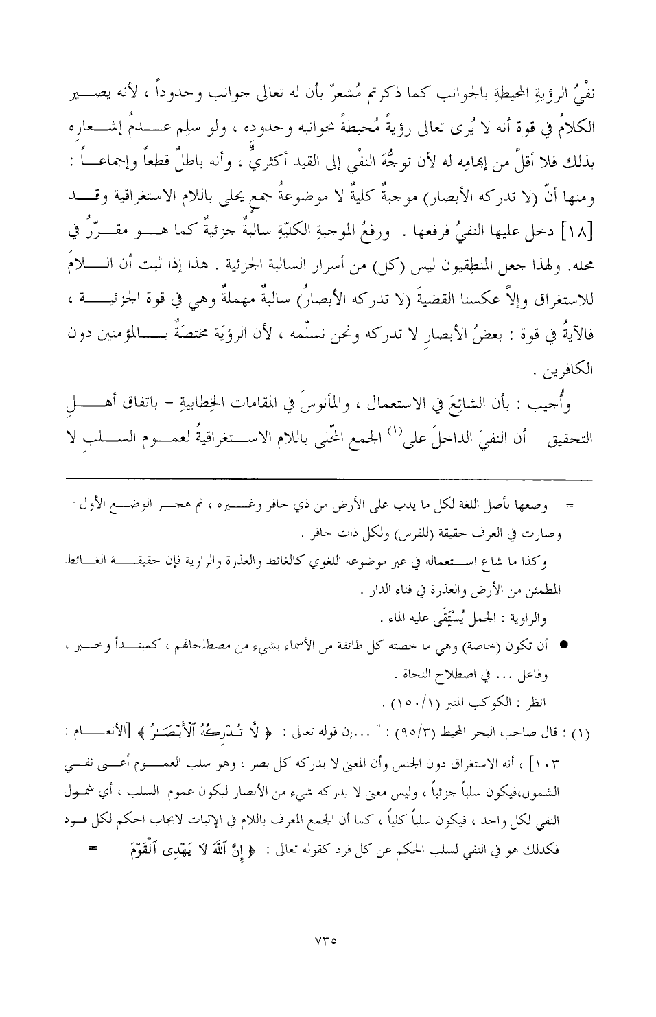 (¬1) قال صاحب البحر المحيط (3/ 95): " ... إن قوله تعالى: {لَا تُدْرِكُهُ الْأَبْصَارُ} الأنعام:103، أنه الاستغراق دون الجنس وان المعني لا يدركه كل بصر، وهو سلب العموم اعني نفي الشمول فيكون سلبا جزئيا، وليس معنى لا يدركه شيء من الأبصار ليكون عموم السلب، أي شمول النفي لكل واحد، فيكون سلبا كليا، كما أن الجمع المعرف باللام في الإثبات لإيجاب الحكم لكل فرد فكذلك هو في النفط لسلب الحكم عن كل فرد كقوله تعالى: {إِنَّ اللَّهَ لَا يَهْدِي الْقَوْمَ الْفَاسِقِينَ} [المنافقون:6] وأجاب بعضهم بجواز أو بكون ذلك باعتبار أنه للجنس، والجنس في النفط يعم وبأن الآية الأولى تعم الأحوال والأوقات وبأن الإدراك بالبصر أخص من الرؤية فلا يلزم من نفيه نفيها