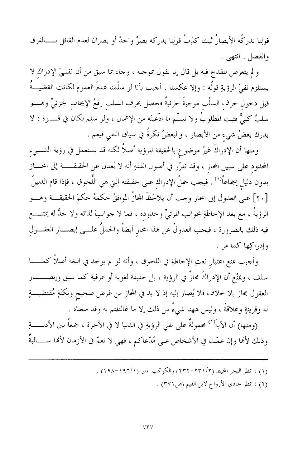 ومنها أن الإدراك غير موضوع بالحقيقة للرؤية أصلا لكنه قد يستعمل في رؤية الشيء المحدود على سبيل المجاز، وقد تقرر في أصول الفقه أنه لا يعدل عن الحقيقة إلى المجاز بدون دليل إجماعا (¬1) فيجب حمل الإدراك على حقيقته التي هي اللحوق، فإذا قام الدليل [20] على العدول إلى المجاز وجب أن يلاحظ المجاز الموافق حكمه حكم الحقيقة وهو الرؤية، مع بعد الاحاطة بجوانب المرئي وحدوده، فما لا جوانب لذاته ولا حد له يمتنع فيه ذلك بالضرورة، فيجب العدول عن هذا المجاز أيضًا والحمل على إبصار العقول وإدراكها كما مر.