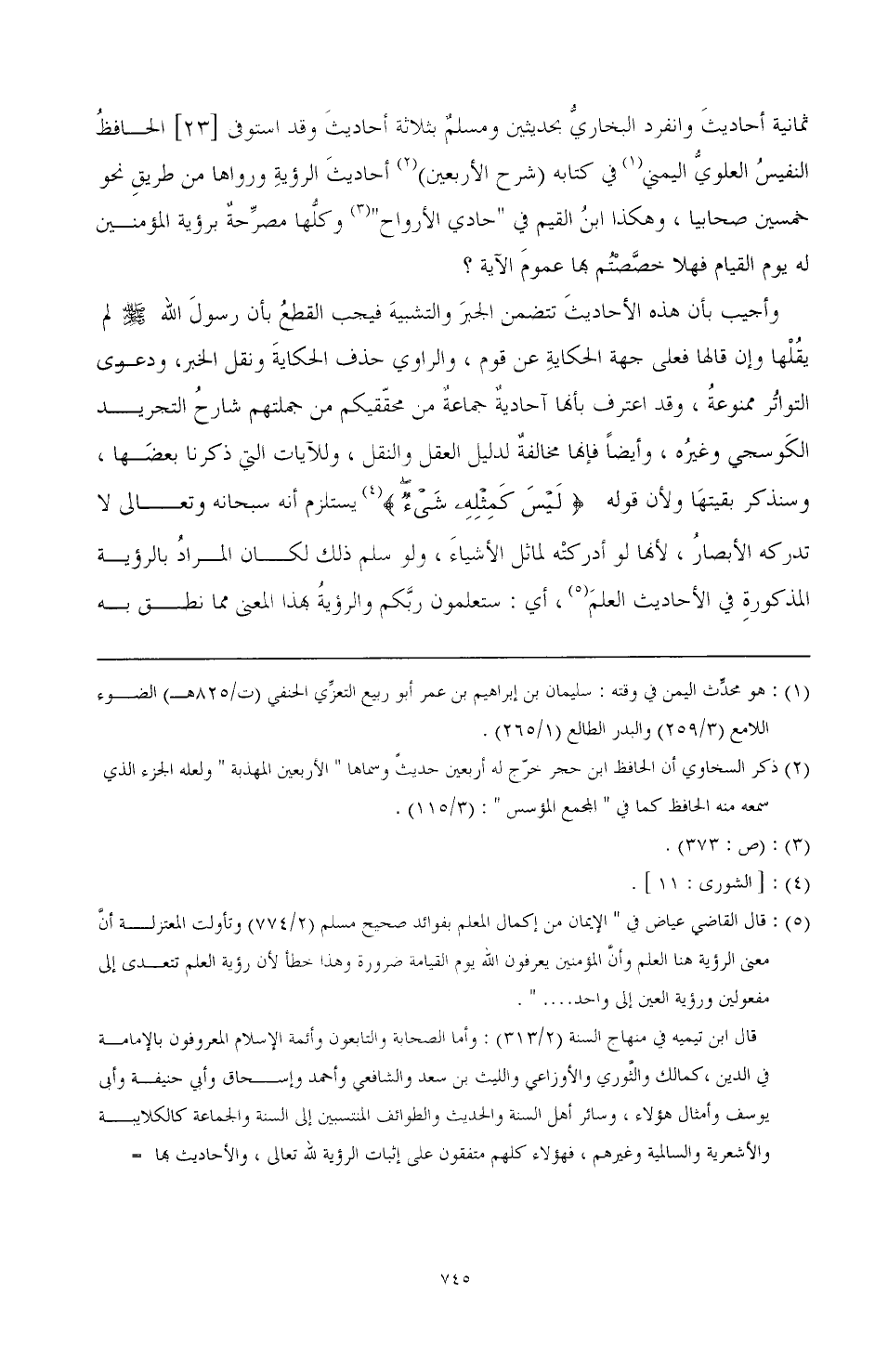 ثمانية أحاديث وانفرد البخاري بحديثين ومسلم بثلاثة أحاديث وقد استوفى [23] الحافظ النفيس العلوي اليمني (¬1) في كتابه (شرح الأربعين) (¬2) أحاديث الرؤية ورواها من طريق نحو خمسين صحابيا، وهكذا ابن القيم في "حادي الأرواح (¬3) وكلها مصرحة برؤية المؤمنين له يوم القيام فهلا خصصتم ها عموم الآية؟