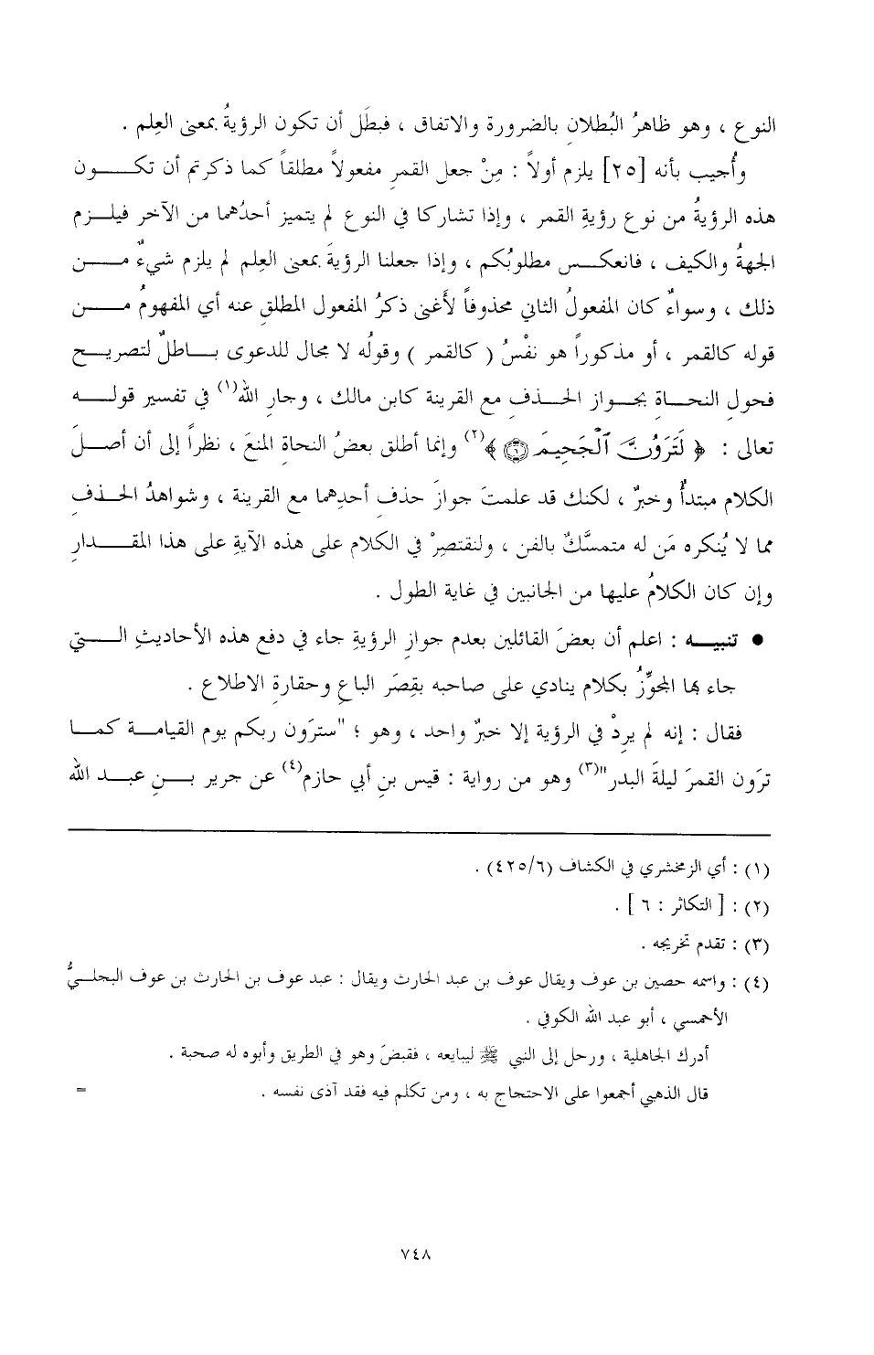 النوع، وهو ظاهر البطلان بالضرورة والاتفاق، فبطل أن تكون الرؤية. معني العلم. وأجيب بأن [25] يلزم أولاً: من جعل القمر مفعولا مطلقا كما ذكرتم أن تكون هذه الرؤية من نوع رؤية القمر، وإذا تشاركا في النوع لم يتميز أحدهما من الآخر فيلزم الجهة والكيف، فانكي مطلوبكم، وإذا جعلنا الرؤية. معني العلم لم يلزم شيء من ذلك، وسواء كان المفعول الثاني محذوفا لأغني ذكر المفعول المطلق عنه أي المفهوم من قوله كالقمر، أو مذكورا هو نفس (كالقمر) وقوله لا مجال للدعوى باطل لتصريح فحول النحاة بجواز الحذف مع القرينة كابن مالك، وجار الله (¬1) في تفسير قوله تعالى: {لترون الجحيم} [التكاثر:6] وإنما أطلق بعض النحاة المنع، نظرا إلى أن أصل الكلام مبتدأ وخبر، لكنك قد علمت جواز حذف أحدهما مع القرينة، وشواهد الحذف مما لا ينكره من له متمسك بالفن، ولنقتصر في الكلام على هذه الآية على هذا المقدار وإن كان الكلام عليها من الجانبين في غاية الطول.