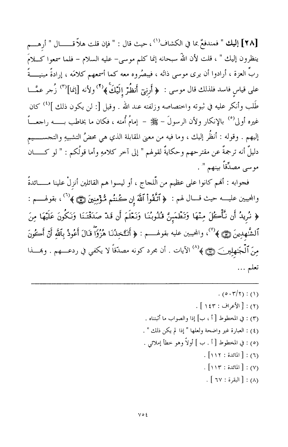 [28] إليك " فمندفع. مما في الكشاف (¬1)، حيث قال: " فإن قلت هلا قال " أرهم ينظرون إليك "، قلت لأن الله سبحانه إنما كلم موسى- عليه السلام- فلما جمعوا كلام رب العزة، أرادوا أن يرى موسى ذاته، فيبصروه معه كما أجمعهم كلامه، إرادة مبنية على قياس فاسد فلذلك قال موسى: {أرنا أنظر إليك} (¬2) ولأنه [إنما] (¬3) زجر عما طلب وأنكر عليه في ثبوته واختصاصه ولفته عند الله. وقيل: لن يكون ذلك (¬4) كان غيره أولى {} بالإنكار ولأن الرسول صَلَّى اللهُ عَلَيْهِ وَسَلَّمَ إمام أمته، فكان ما يخاطب به راجعا إليهم. وقوله: أنظر إليك، وما فيه من معي المقابلة الذي هي محض التشبيه والتجسيم دليل أنه ترجعه عن مقترحهم وحكاية لقولهم " إلى آخر كلامه وأما قولكم: " لو كان موسى مصدقا بينهم ".