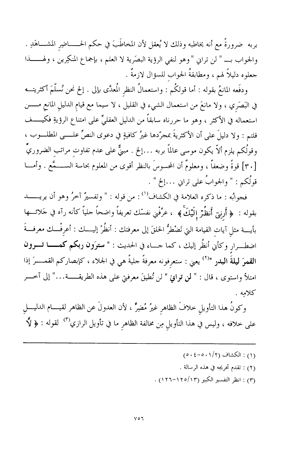 بربه ضرورة مع أنه يخاطبه وذلك لا يعقل لأن المخاطب في حكم الحاضر المشاهد. والجواب ب " لن تراني " وهو لنفى الرؤية البصرية لا العلم، بإجماع المنكرين، ولهذا جعلوه دليلا لهم، ومطابقة الجواب للسؤال لازمة.