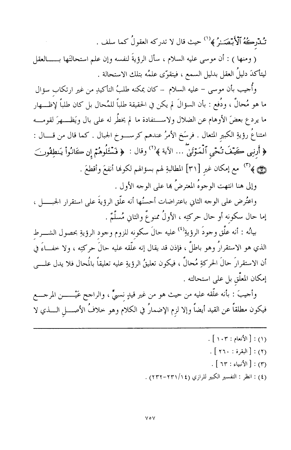 واعترض على الوجه الثاني باعتراضات أحسنها أنه علق الرؤية على استقرار الجبل، إما حال سكونه أو حال حركته، الأول ممنوع والثاني مسم.