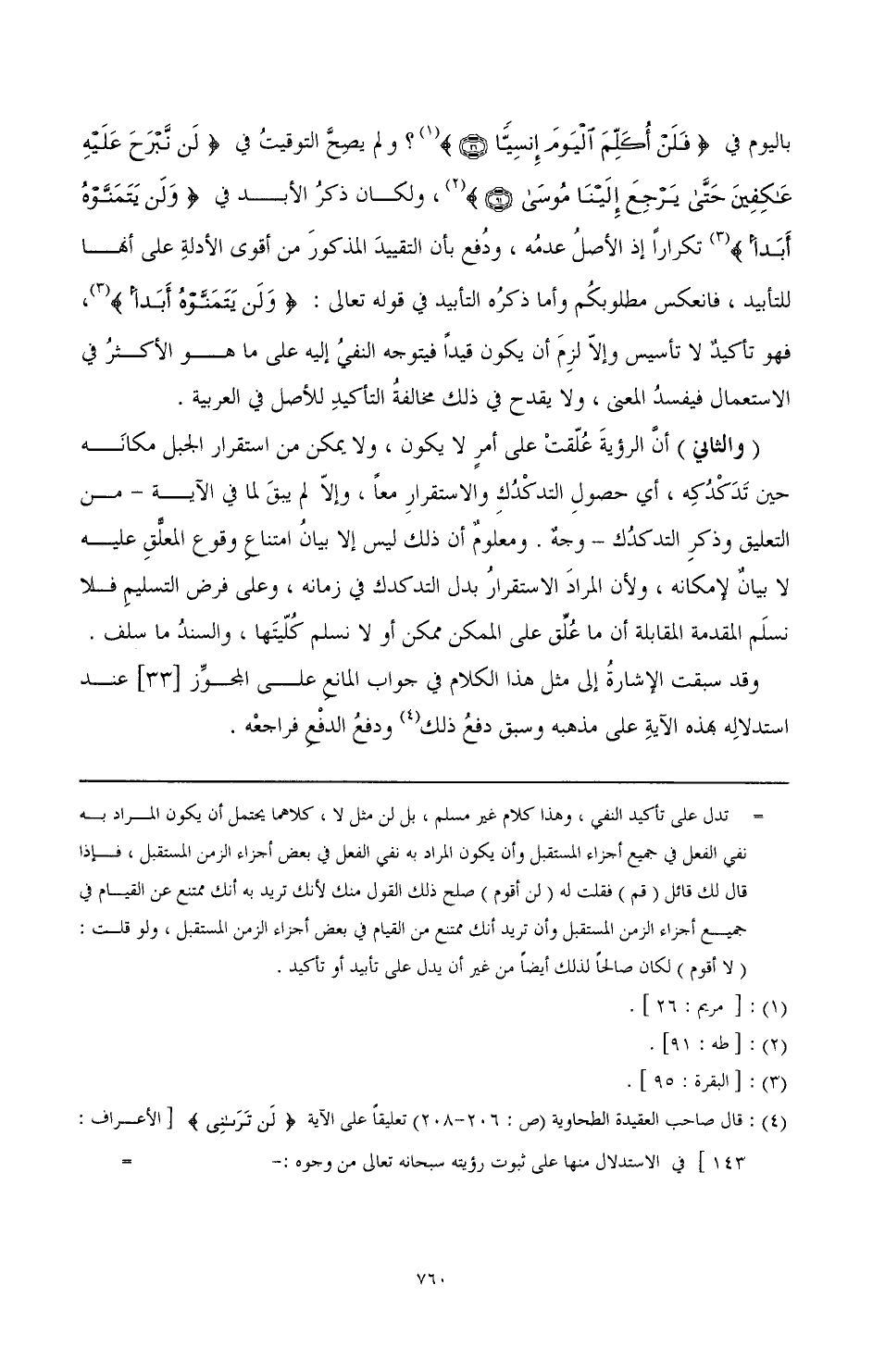 (¬5) قال صاحب العقيدة الطحاوية (ص: 206 - 208) تعليقا على الآية {لن تراني} الأعراف:143 في الاستدلال منها على ثبوت رؤيته سبحانه تعالى من وجوه