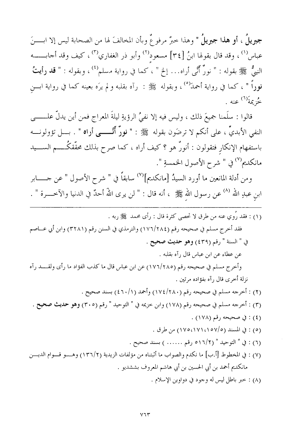 جبريل، أو هذا جبريل " وهذا خبر مرفوع وبأن المخالف لها من الصحابة ليس إلا ابن عباس (¬1)، وقد قال بقولها ابن [34] مسعود (¬2) وأبو ذر الغفاري (¬3)، كيف وقد أجابه النبي صَلَّى اللهُ عَلَيْهِ وَسَلَّمَ بقوله: " نور إني أراه ... الخ"، كما في رواية مسلم (¬4)، وبقوله: " قد رأيت نورا، كما في رواية أحمد وبقوله كل: رآه بقلبه ولم يره بعينه كما في رواية ابن خزيمة (¬5) عنه.