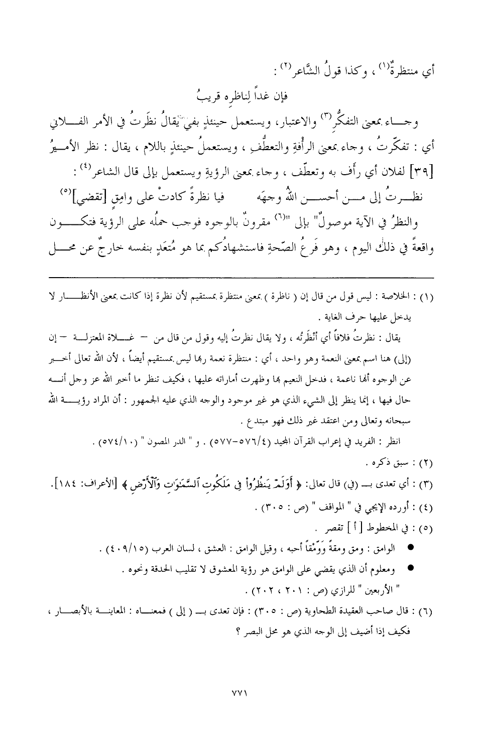 (¬6) قال صاحب العقيدة الطحاوية (ص: 305): فإن تعدى ب (إلى) فمعناه: المعاينة بالأبصار، فكيف إذا أضيف إلى الوجه الذي هو محل البصر