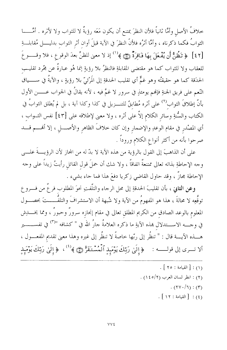 على أن الذاهب إلى القول بالرؤية من هذه الآية لا بد له من المجاز لأن الرؤية على وجه الإحاطة بذاته تعالى ممتنعة الفاقا، ولا شك أن حمل قول القائل رأيت زيدا على وجه الإحاطة مجاز، وقد حاول القاضي زكريا دفع هذا فما جاء بشيء. وعن الثاني، بأن تقليب الحدقة إلى محل الرجاء والتلفت نحو المطلوب فرع من فروع توقعه لا محالة، هذا هو المفهوم من الآية ولا شبهة أن الاستشراف بحصول المعلوم بالوعد الصادق من الكريم المطلق تعالى في مقام إنجازه سرور وحبور، ومما يخش في وجه الاستدلال هذه الآية ما ذكره العلامة جار الله في "كشافه" (3) في تفسير هذه الآية قال " تنظر إلى ربها خاصة لا تنظر إلى غيره وهذا معنى تقلم المفعول، ألا ترى إلى قوله:} إِلَى رَبِّكَ يَوْمَئِذٍ الْمُسْتَقَرُّ {(¬3)} إِلَى رَبِّكَ يَوْمَئِذٍ الْمَسَاقُ & (¬4)