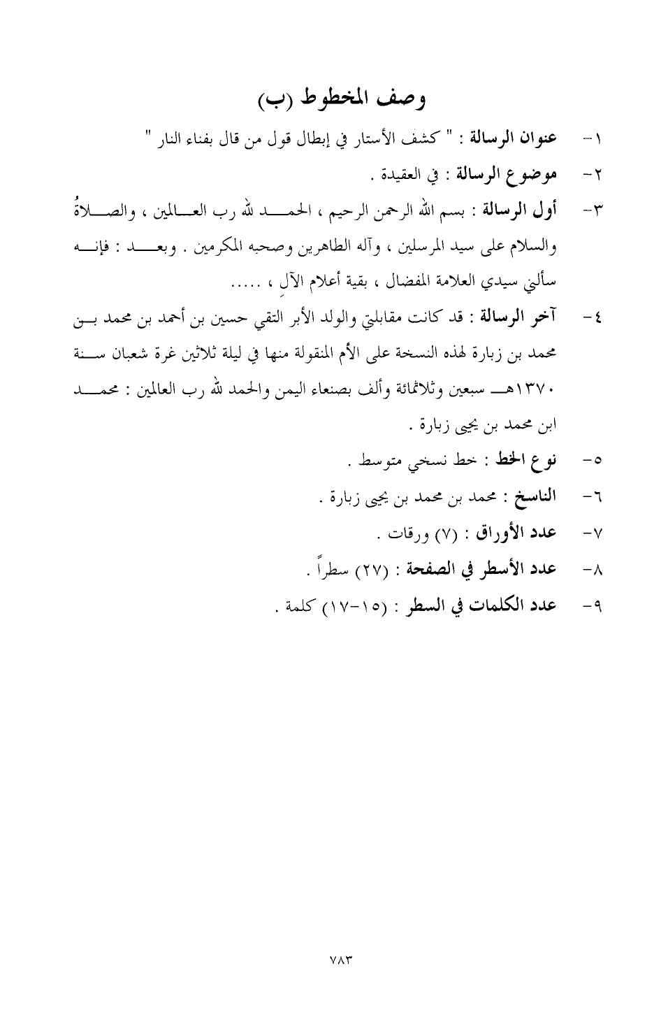 1 - عنوان الرسالة: " كشف الأستار في إبطال قول من قال بفناء النار "