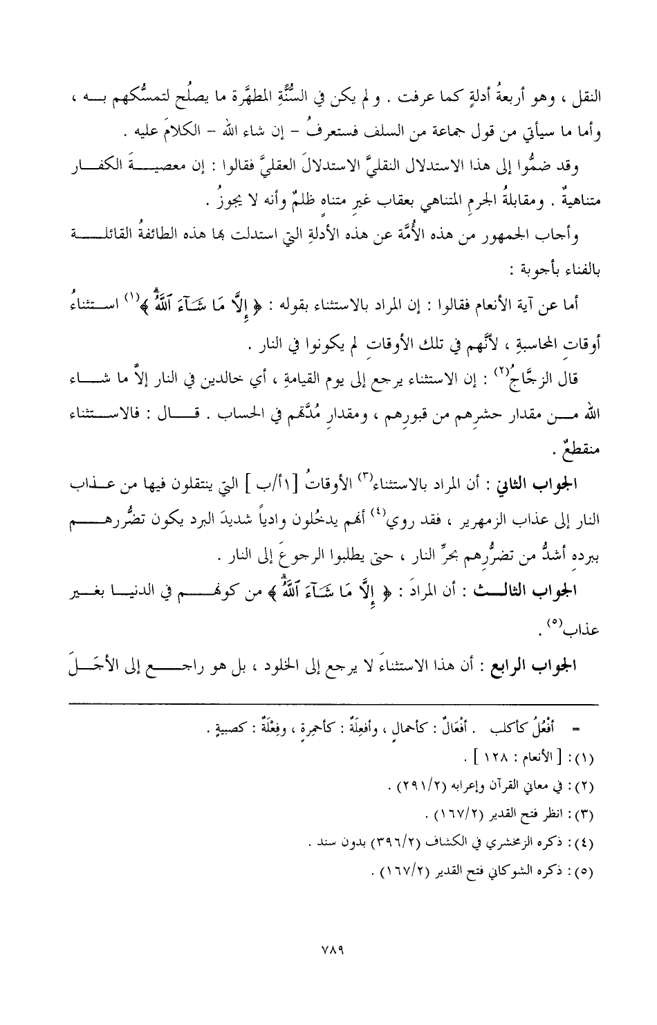 الجواب الثالث: أن المراد: (إلا ما شاء الله) من ص ض في الدنيا بغير عذاب (¬5) الجواب الرابع: أن هذا الاستثناء لا يرجع إلى الخلود، بل هو راجع إلى الأجل
