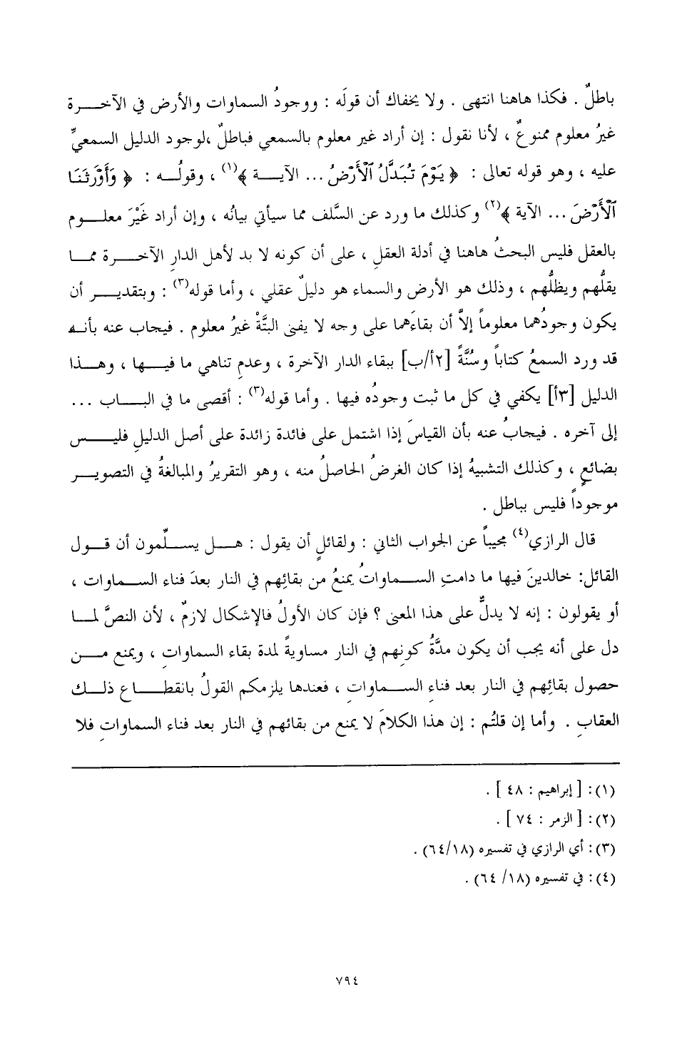 باطل. فكذا هاهنا انتهى. ولا يخفاك أن قوله: ووجود السماوات والأرض في الآخرة غير معلوم ممنوع، لأنا نقول: إن أراد غير معلوم بالسمعي فباطل، لوجود الدليل السمعي عليه، وهو قوله تعالى: {يوم تبدل الأرض ... الآية} (¬1)، وقوله: (وأورثنا الأرض الآية& (¬2) وكذلك ما وفى عن السلف مما سيأتي بيانه، وإن أراد غير معلوم بالعقل فليس البحث هاهنا في أدلة العقل، على أن كونه لا بد لأهل الدار الآخرة مما يقلهم ويظلهم، وذلك هو الأرض والسماء هو دليل عقلي، وأما قوله (3): وبتقدير أن يكون وجودهما معلوما إلا أن بقاءها على وجه لا يفئ البتة غير معلوم. فيجاب عنه بأنه قد ورد السمع كتابا وسنة [2أ/ب] ببقاء الدار الآخرة، وعدم تناهي ما فيها، وهذا الدليل [3أ] يكفي في كل ما ثبت وجوده فيها. وأما قوله (3): أقصى ما في الباب ... إلى آخره. فيجاب عنه بأن القياس إذا اشتمل على فائدة زائدة على أصل الدليل فلير بضائع، وكذلك التشبيه إذا كان الغرض الحاصل منه، وهو التقرير والمبالغة في التصوير موجودا فليس بباطل.