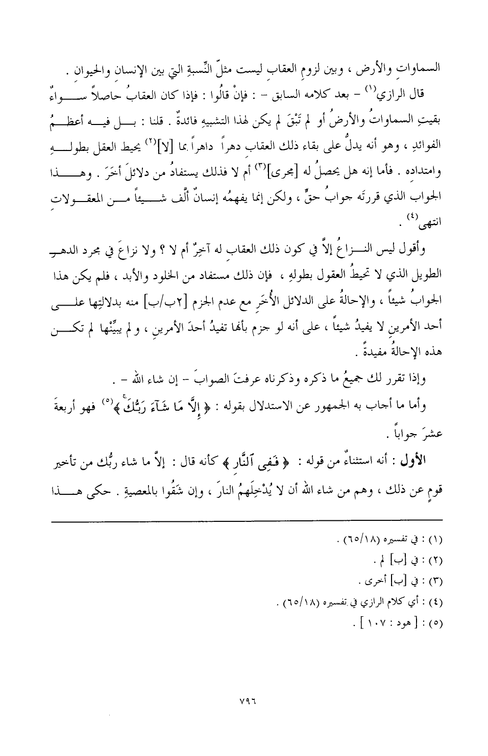 السماوات والأرض، وبن لزوم العقاب ليست مثل النسبة التي بين الإنسان والحيوان. قال الرازي (¬1) بعد كلامه السابق-: فإن قالوا: فإذا كان العقاب حاصلا سواء بقيت السماوات والأرض أو لم تبق لم يكن لهذا التشبيه فائدة. قلنا: بل فيه أعظم الفوائد، وهو أنه يدلا على بقاء ذلك العقاب دهرا. مما ألا (¬2) يحيط العقل بطوله وامتداده. فأما إنه هل يحصل له أمجرى (¬3) أم لا فذلك يستفاد من دلائل أخر. وهذا الجواب الذي قررته جواب حق، ولكن إنما يفهمه إنسان ألف شيئا من المعقولات انتهى (¬4) وأقول ليس النزاع إلا في كون ذلك العقاب له آخر أم لا؟ ولا نزاع في مجرد الطويل الذي لا تحيط العقول بطوله، فإن ذلك مستفاد من الخلود والأبد، فلم يكن هذا الجواب شيئا، والإحالة على الدلائل إلا لم خر مع عدم الجزم منه بدلالتها على أحد الأمرين لا يفيد شيئا، على أنه لو جزم بأنها تفيد أحد الأمرين، ولم يبينها لم تكن هذه الإحالة مفيدة.