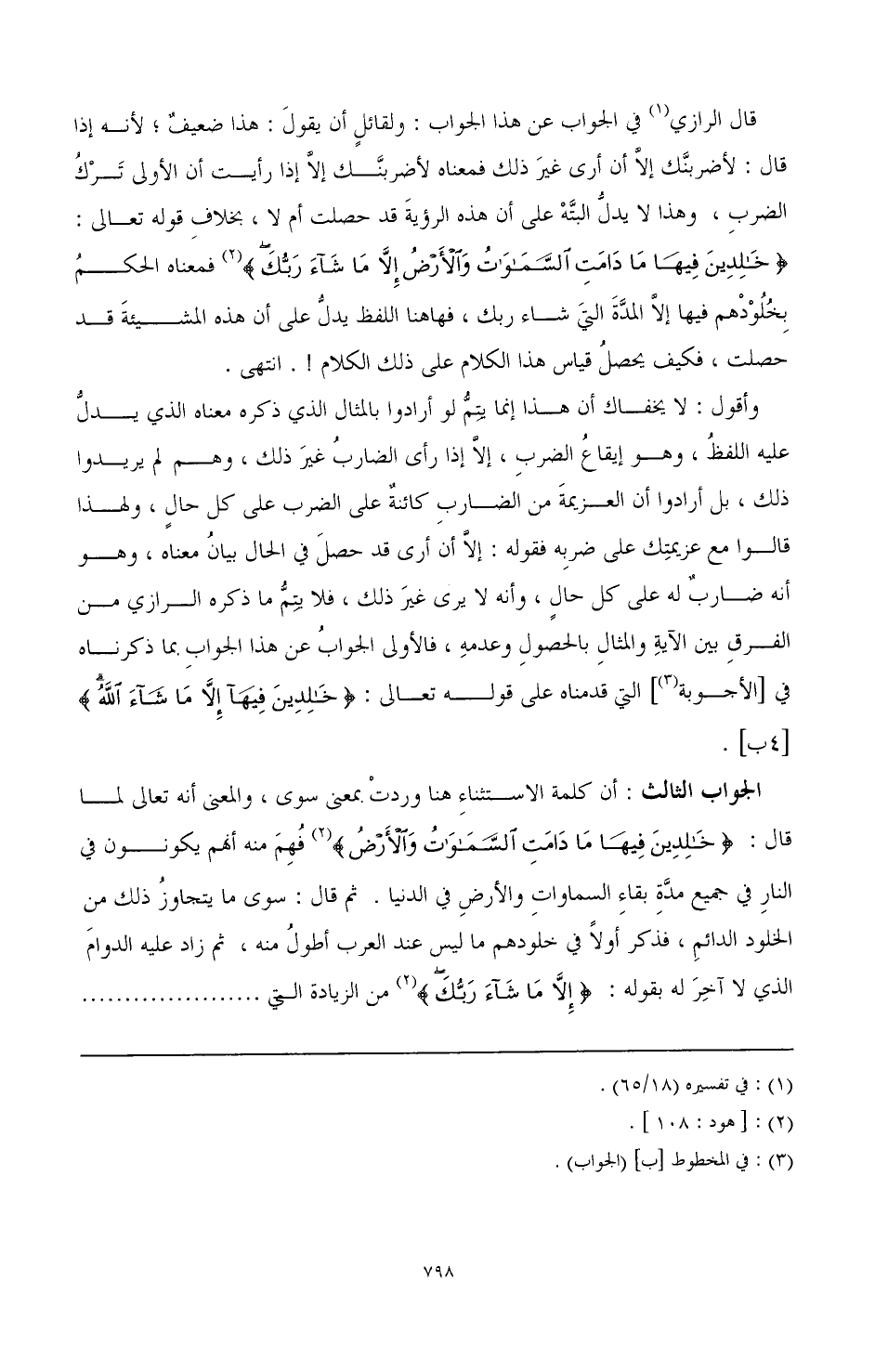 الجواب الثالث: أن كلمة الاستثناء هنا وردت. معنى سوى، والمعنى أنه تعالى لما قال: (خالدين فيها ما دامت السماوات والأرض {(¬4) فهم منه أفم يكونون في النار في جميع بقاء السماوات والأرض في الدنيا. ثم قال: سوى ما يتجاوز ذلك من الخلود الدائم، فذكر أولا في خلودهم ما ليس عند العرب أطول منه، ثم زاد عليه الدوام الذي لا آخر له بقوله:} إلا ما شاء ربك& (¬5) من الزيادة التي ..............