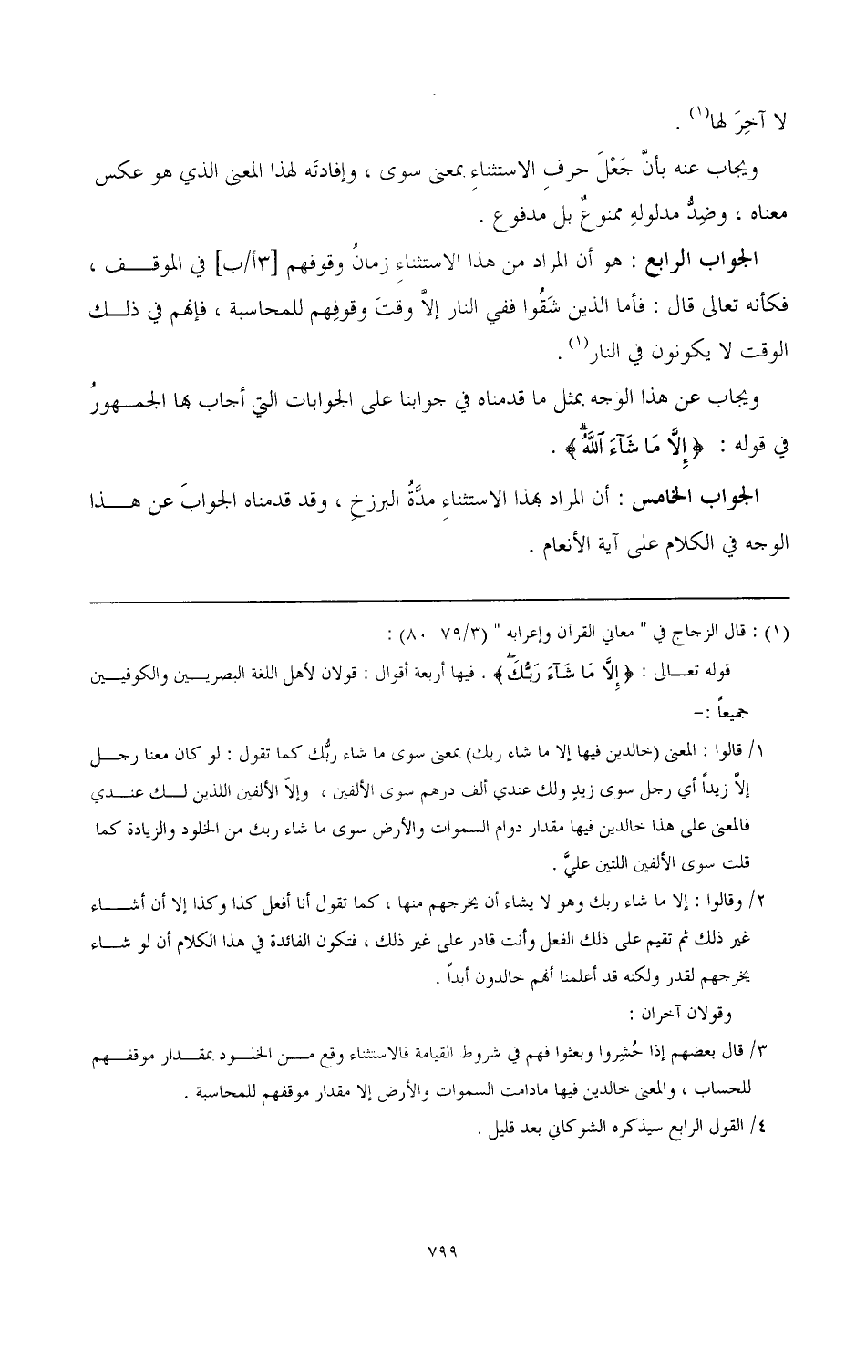 الجواب الرابع: هو أن المراد من هذا الاستثناء زمان وقوفهم في الموقف، فكأنه تعالى قال: فأما الذين شقوا ففي النار إلا وقت وقوفهم للمحاسبة، فإنهم في ذلك الوقت لا يكونون في النار (¬2)