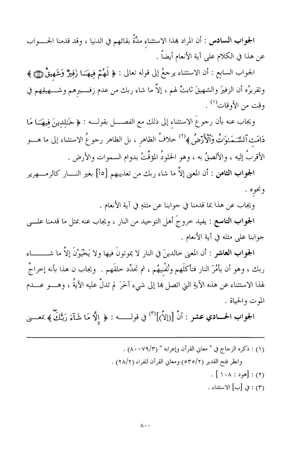 الجواب السابع: أن الاستثناء يرجع إلى قوله تعالى: ا لهتم فيها زفير وشهيق وتقريره أن الزفير والشهيق ثابت لهم، إلا ما شاء ربك من عدم زفيرهم وشهيقهم في وقت من الأوقات (¬1) ويجاب عنه بأن رجوع الاستثناء إلى ذلك مع الفصل قوله: (خالدين فيها ما دامت السماوات والأرض {(¬2) خلاف الظاهر، بل الظاهر رجوع الاستثناء إلى ما هو الأقرب إليه، والألصق به، وهو الخلود المؤقت بدوام السماوات والأرض.