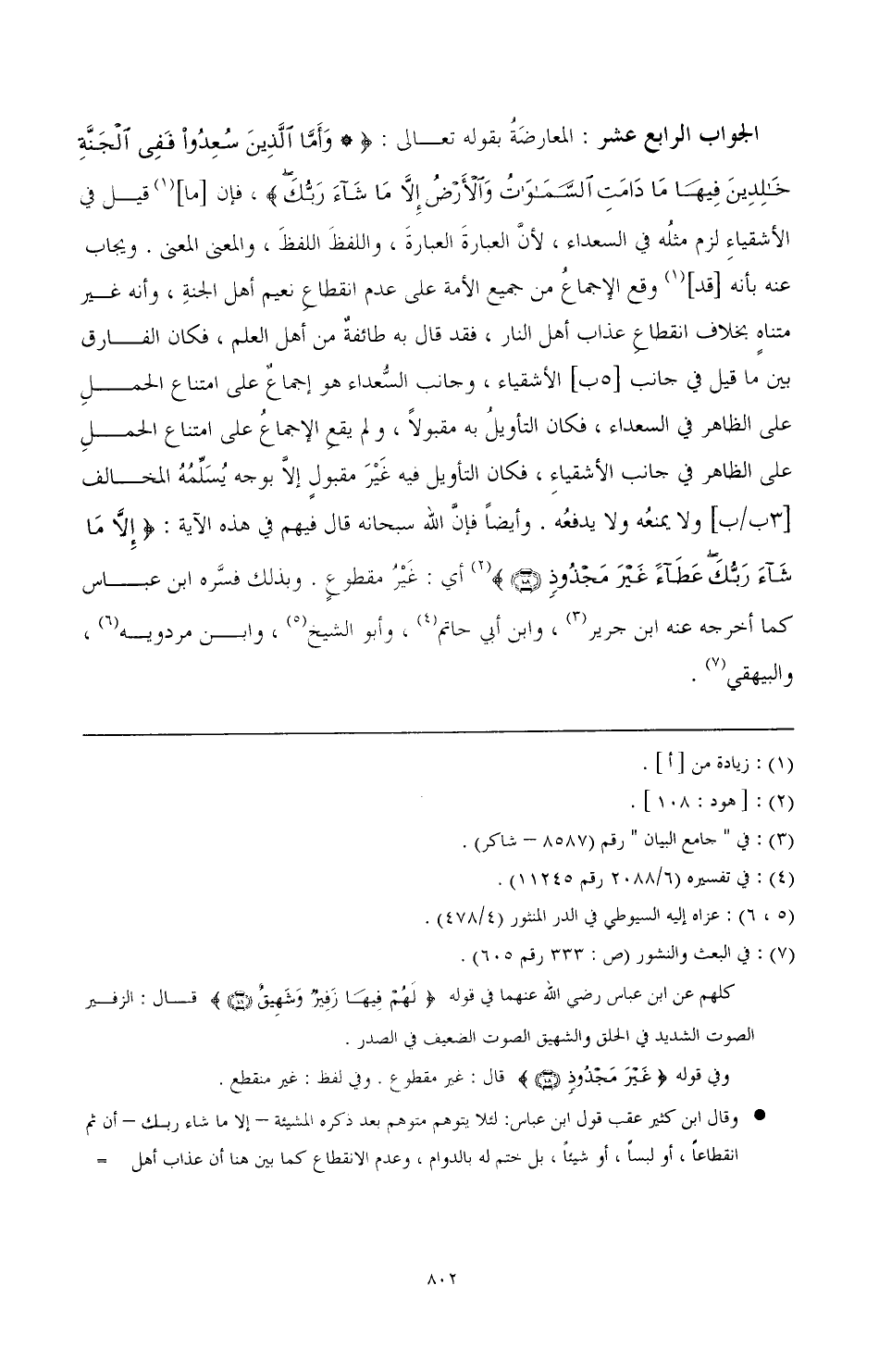 الجواب الرابع عشر: المعارضة بقوله تعالى: {وَأَمَّا الَّذِينَ سُعِدُوا فَفِي الْجَنَّةِ خَالِدِينَ فِيهَا مَا دَامَتِ السَّمَاوَاتُ وَالْأَرْضُ إِلَّا مَا شَاءَ رَبُّكَ} فإن [ما] (¬1) قيل في الأشقياء لزم مثله في السعداء، لأن العبارة العبارة، واللفظ اللفظ، والمعنى المعنى. ويجاب عنه بأنه أقدا (¬2) وقع الإجماع من جميع الأمة على عدم انقطاع نعيم أهل الجنة، وأنه غير متناه بخلاف انقطاع عذاب أهل النار، فقد قال له طائفة من أهل العلم، فكان الفارق بين ما قيل في جانب الأشقياء، وجانب السعداء هو إجماع على امتناع الحمل على الظاهر في السعداء، فكان التأويل به مقبولا، ولم يقع الإجماع على امتناع الحمل على الظاهر في جانب الأشقياء، فكان التأويل فيه غير مقبول إلا بوجه يسلمه المخالف ولا يمنعه ولا يدفعه. وأيضا فإن الله سبحانه لمحال فيهم في هذه الآية: {إِلَّا مَا شَاءَ رَبُّكَ عَطَاءً غَيْرَ مَجْذُوذٍ} (¬3) أقي: غير مقطوع. وبذلك فسره ابن عباس كما أخرجه عنه ابن جرير (¬4)، وابن أبي حاتم (¬5)، وأبو الشيخ، وابن مردويه (¬6) والبيهقي (¬7).