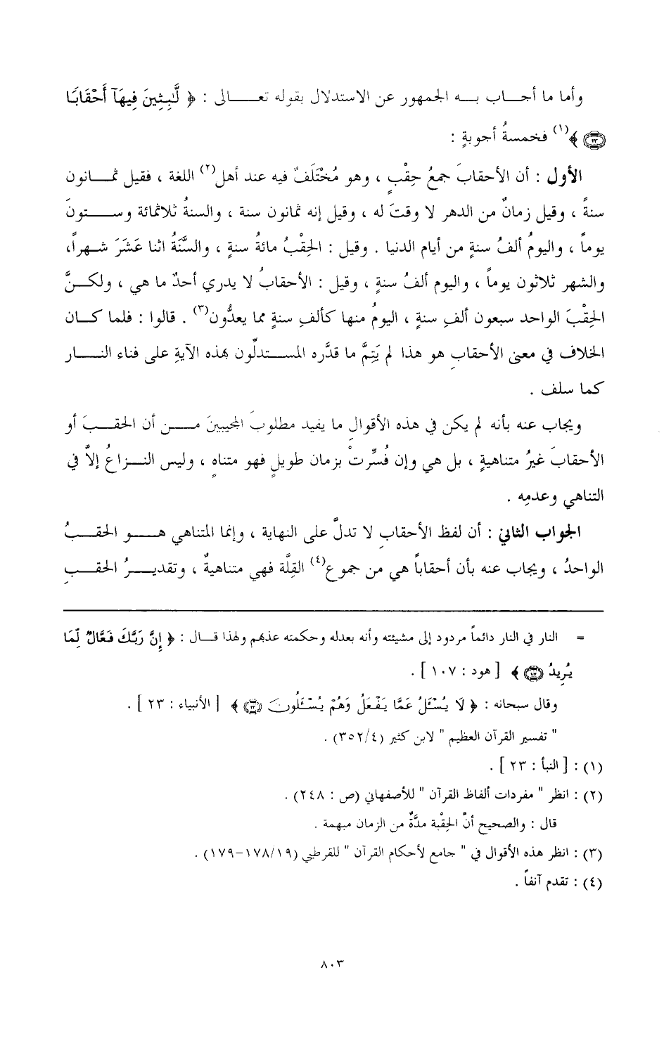 ويجاب عنه بأنه لم يكن في هذه الأقوال ما يفيد مطلوب المجيبين من أن الحقب أو الأحقاب غير متناهية، بل هي وإن فسرت بزمان طويل فهو متناه، وليس النزاع إلا في التناهي وعدمه.