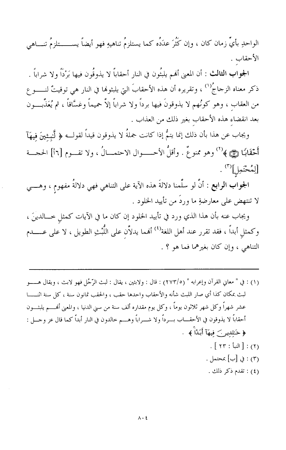 ويجاب عنه بأن هذا الذي ورد في تأييد الخلود إن كان ما في الآيات كمثل خالدين، وكمثل أبدا، فقد تقرر عند أهل اللغة (¬4) أفما يدلان على اللبث الطويل، لا على عدم التناهي، وإن كان بغيرهما فما هو؟.