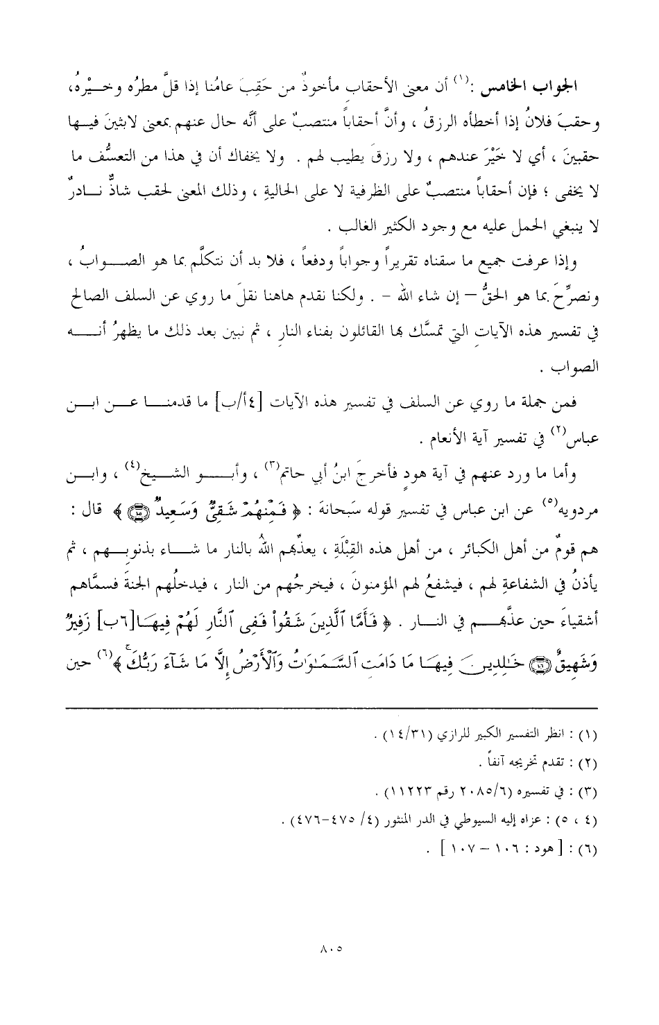 وإذا عرفت جميع ما سقناه تقريرا وجوابا ودفعا، فلا بد أن نتكلم. مما هو الصواب، ونصرح. مما هو الحق- إن شاء الله-. ولكنا نقدم هاهنا نقل ما روي عن السلف الصاع في تفسير هذه الآيات التي تمسك جما القائلون بفناء النار، ثم نبين بعد ذلك ما يظهر أنه ا لصواب.