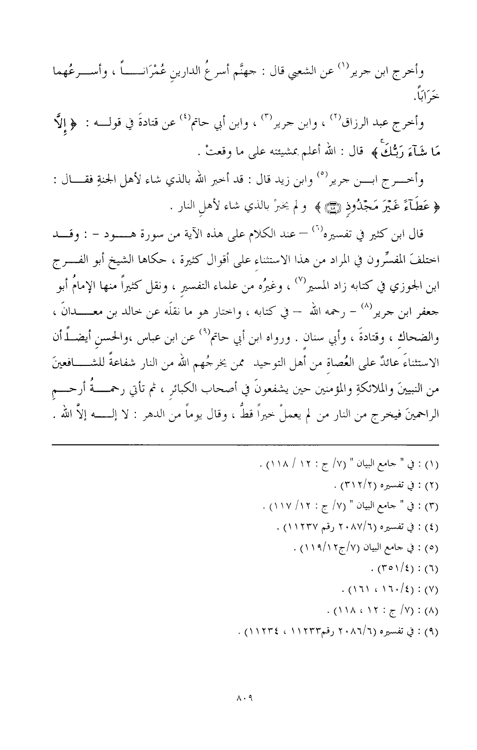 قال ابن كثير في تفسيره (¬5) - عند الكلام على هذه الآية من سورة هود-: وقد اختلف المفسرون في المراد من هذا الاستثناء على أقوال كثيرة، حكاها الشيخ أبو الفرج ابن الجوزي في كشابه زاد المسير (¬6)، وغيره من علماء التفسير، ونقل كثيرا منها الإمام أبو جعفر ابن جري (¬7) (8) - رحمه الله- في كتابه، واختار هو ما نقله عن خالد بن معدان، والضحاك، وقتاده، وأبي سنان. ورواه ابن أبي حاتم (¬8) عن ابن عباس، والحسن أيضل أن الاستثناء عائد على العصاه من أهل التوحيد ممن يخرجهم الله من النار شفاعة للشافعين من النبيين والملائكة والمؤمنين حين يشفعون في أصحاب الكبائر، ثم تأتي رحمة أرحم الراحمين فيخرج من النار من لم يعمل خيرا قط، وقال يوما من الدهر: لا إله إلا الله.
