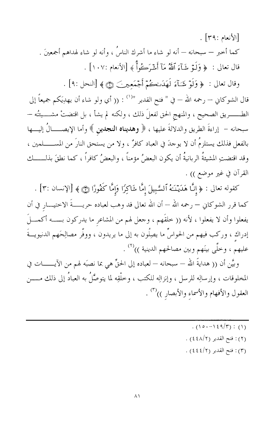 قال الشوكاني- رحمه الله- في " فتح القدير" (¬1) ((أي ولو شاء أن يهديكم جميعا إلى الطريق الصحيح، والمنهج الحق لفعل ذلك، ولكنه لم يشأ، بل اقتضت مشيئته - سبحانه - إراءة الطريق والدلالة عليها، {وهديناه النجدين} وأما الإيصال إليها بالفعل فذلك يستلزم أن لا يوجد في العباد كافر، ولا من يستحق النار من المسلمين، وقد اقتضت المشيئة الربانية أن يكون البعض مؤمنا، والبعض كافرا، كما نطق بذلك القرآن في غير موضع)).