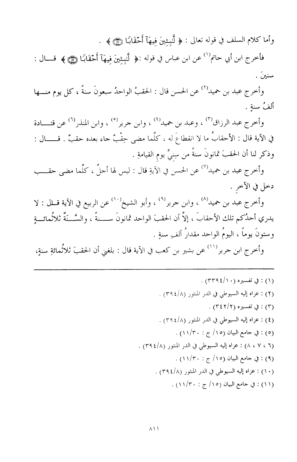 وأخرج عبد الرزاق (¬3)، وعبد بن حميد (¬4)، وابن جرير (¬5)، وابن المنذر (¬6) عن قتاده في الآية قال: الأحقاب ما لا انقطاع له، كفا مضى حقب جاء بعده حقب. قال: وذكر لنا أن الحقب ثمانون سنة من سنين يوم القيامة.