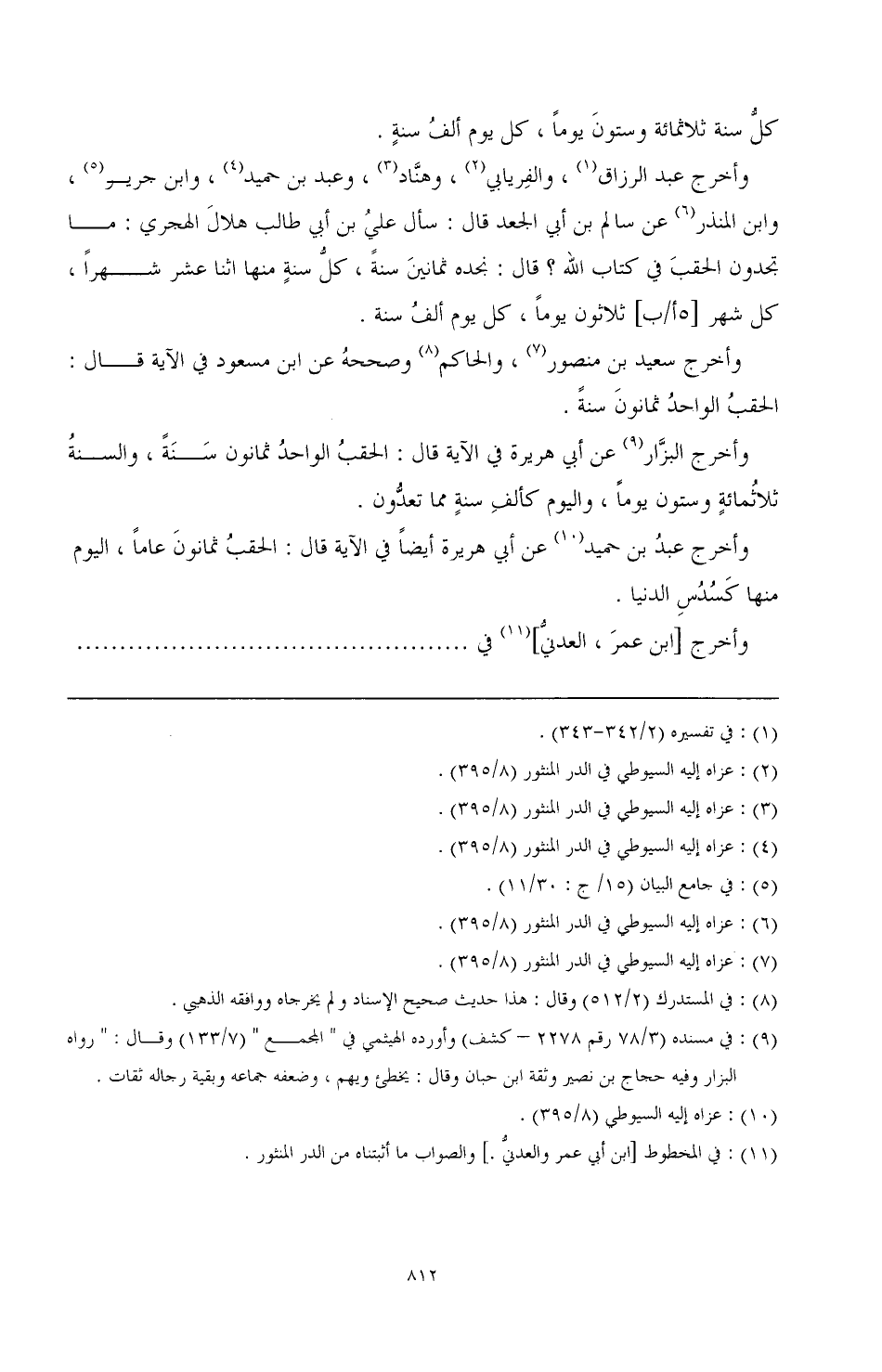 وأخرج عبد الرزاق (¬1)، والفريابي (¬2)، وهناد (¬3)، وعبد بن حميد (¬4)، وابن جرير (¬5)، وابن المنذر (¬6) عن سالم بن أبي الجعد قال: سأل علي بن أبي طالب هلال الهجري: ما تجدون الحقب في كتاب الله؟ قال: نجده ثمانين سنة، كل سنة منها اثنا عشر شهرا، كل شهر [5أ/ب] أ ثلاثون يوما، كل يوم ألف سنة.