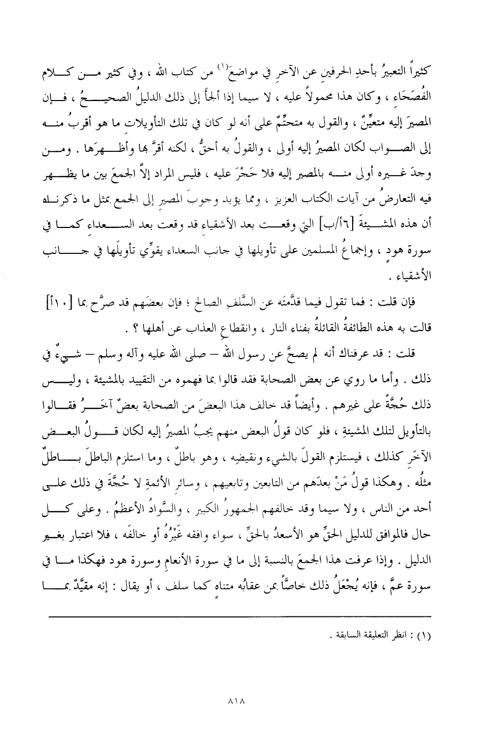 كثيرا التعبير بأحد الحرفين عن الآخر في مواضع (¬1) من كتاب الله، وفي كثير من كلام الفصحاء، وكان هذا محمولا عليه، لا سيما إذا ألجأ إلى ذلك الدليل الصحيح، فإن المصير إليه متعين، والقول به متحتم على أنه لو كان في تلك التأويلات ما هو أقرب منه إلى الصواب لكان المصير إليه أولى، والقول به أحق، لكنه أقر ها وأظهرها. ومن وجد غيره أولى منه بالمصير إليه فلا حجر عليه، فليس المراد إلا الجمع بين ما يظهر فيه التعارض من آيات الكتاب العزيز، ومما يؤيد وجوب المصير إلى الجمع. ممثل ما ذكر له أن هذه المشيئة [6أ/ب] التي وقعت بعد الأشقياء قد وقعت بعد السعداء كما في سورة هود، وإجماع المسلمين على تأويلها في جانب السعداء يقوي تأويلها في جانب الأشقياء.