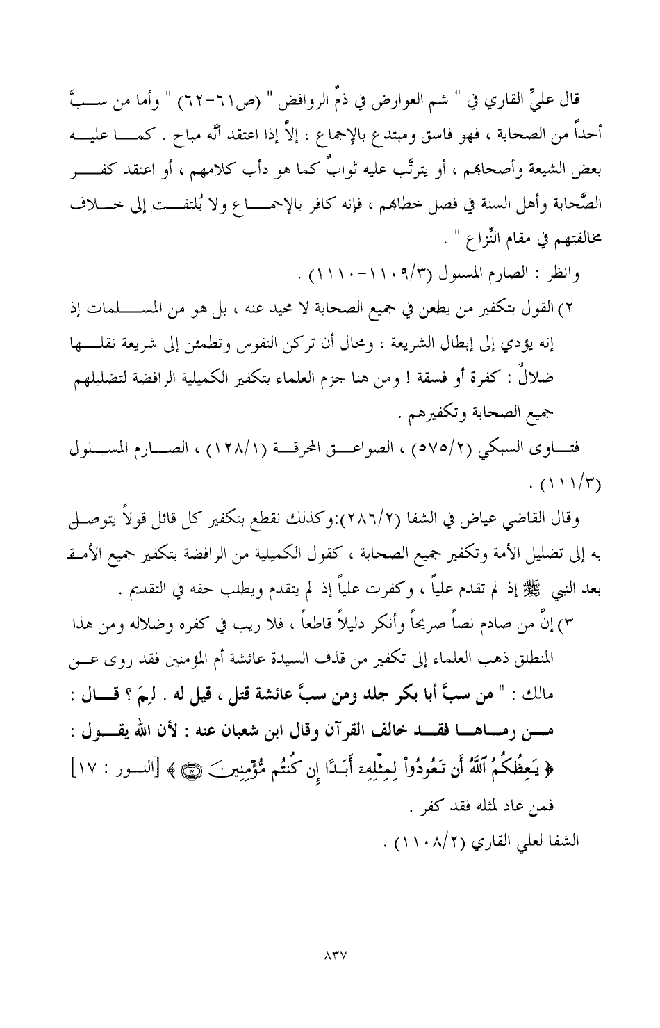 قال علي القاري في " شم العوارض في ذم الروافض " (ص 61 - 62) " وأما من سب أحدا من الصحابة، فهو فاسق ومبتدع بالإجماع، إلا إذا اعتقد أنه مباح. كما عليه بعض الشيعة وأصحابهم، أو يترتب عليه ثواب كما هو دأب كلامهم، أو اعتقد كفر الصحابة وأهل السنة في فصل خطاهم، فإنه كافر بالإجماع ولا يلتفت إلى خلاف مخالفتهم في مقام النزاع ".