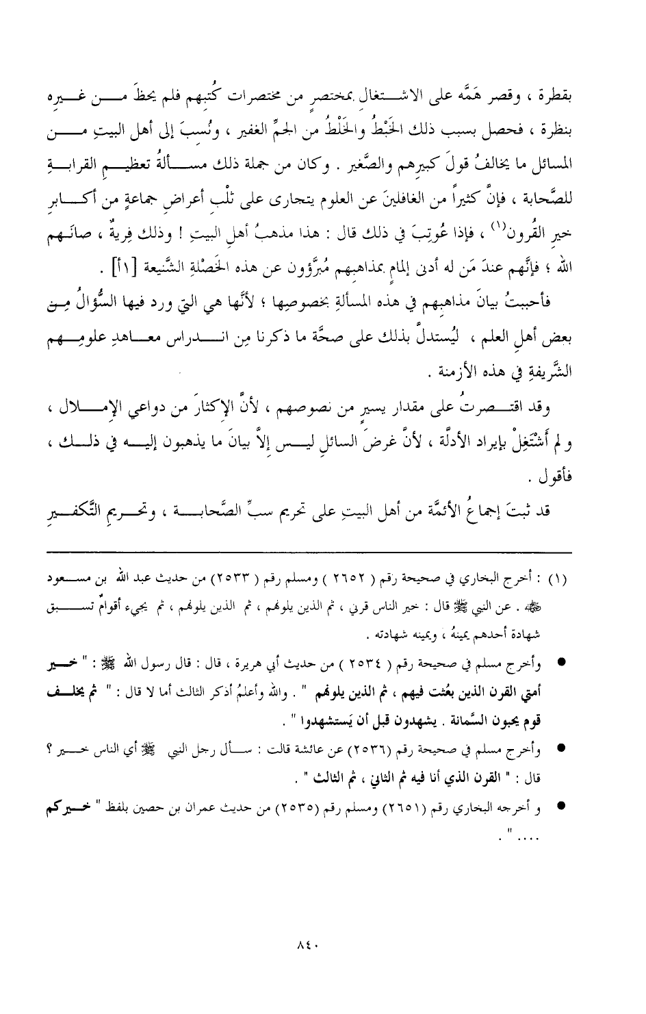 وأخرج مسلم في صحيحة رقم (2534) من حديث أبي هريرة، قال: قال رسول الله صَلَّى اللهُ عَلَيْهِ وَسَلَّمَ: " خر أمتي القرن الذين بعثت فيهم، ثم الذين يلونهم ". والله وأعلم أذكر الثالث أما لا قال: " ثم يخلف قوم يحبون السمانة. يشهون قبل أن يستشهدوا ".