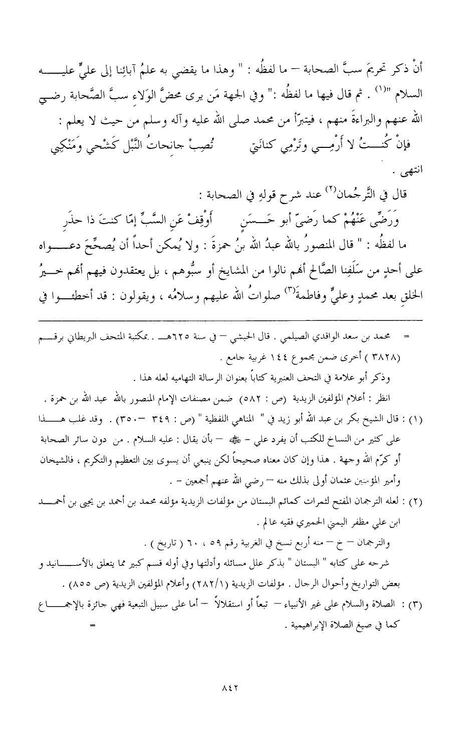 أن ذكر تحريم سب الصحابة- ما لفظه: " وهذا ما يقضى به علم آبائنا إلى على عليه السلام (¬1) ثم قال فيها ما لفظه: " وفي الجهة من يرى محض الولاء سب الصحابة رضي الله عنهم والبراعق منهم، فيتبرأ من محمد صَلَّى اللهُ عَلَيْهِ وَآلِهِ وَسَلَّمَ من حيث لا يعلم: