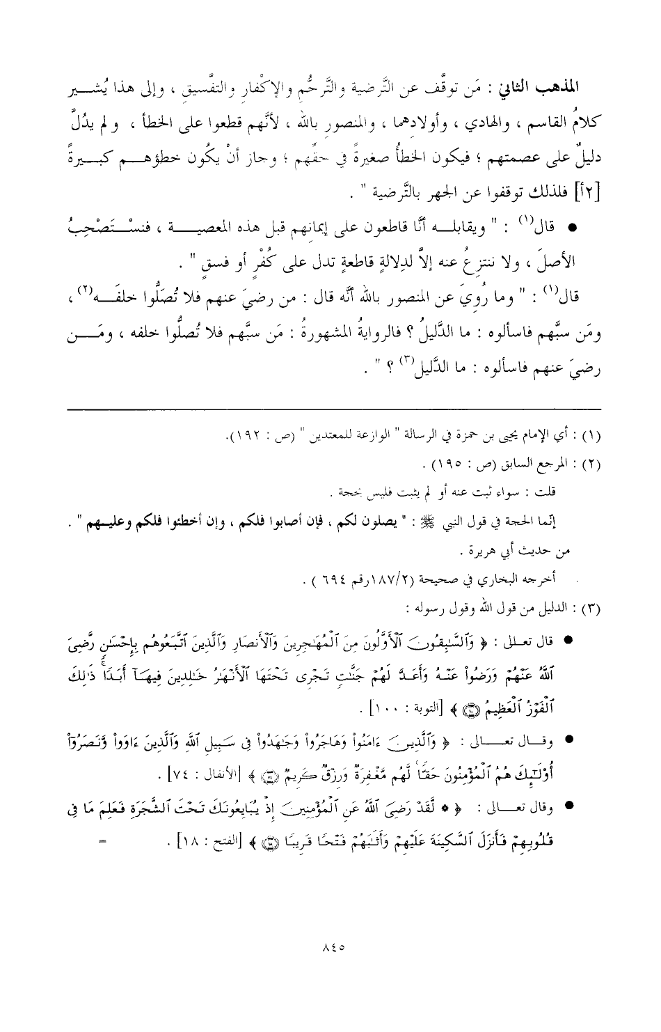 المذهب الثاني: من توقف عن الترضية والترحم والإكفار؟ التفسيق، وإلى هذا يشير كلام القاسم، والهادي، وأولادهما، والمنصور بالله، لأنهم قطعوا على الخطأ، ولم يدل دليل على عصمتهم بم فيكون الخطأ صغيرة في حقهم، وجاز أن يكون خطؤهم كبيرة فلذلك توقفوا عن الجهر بالترضية ". .