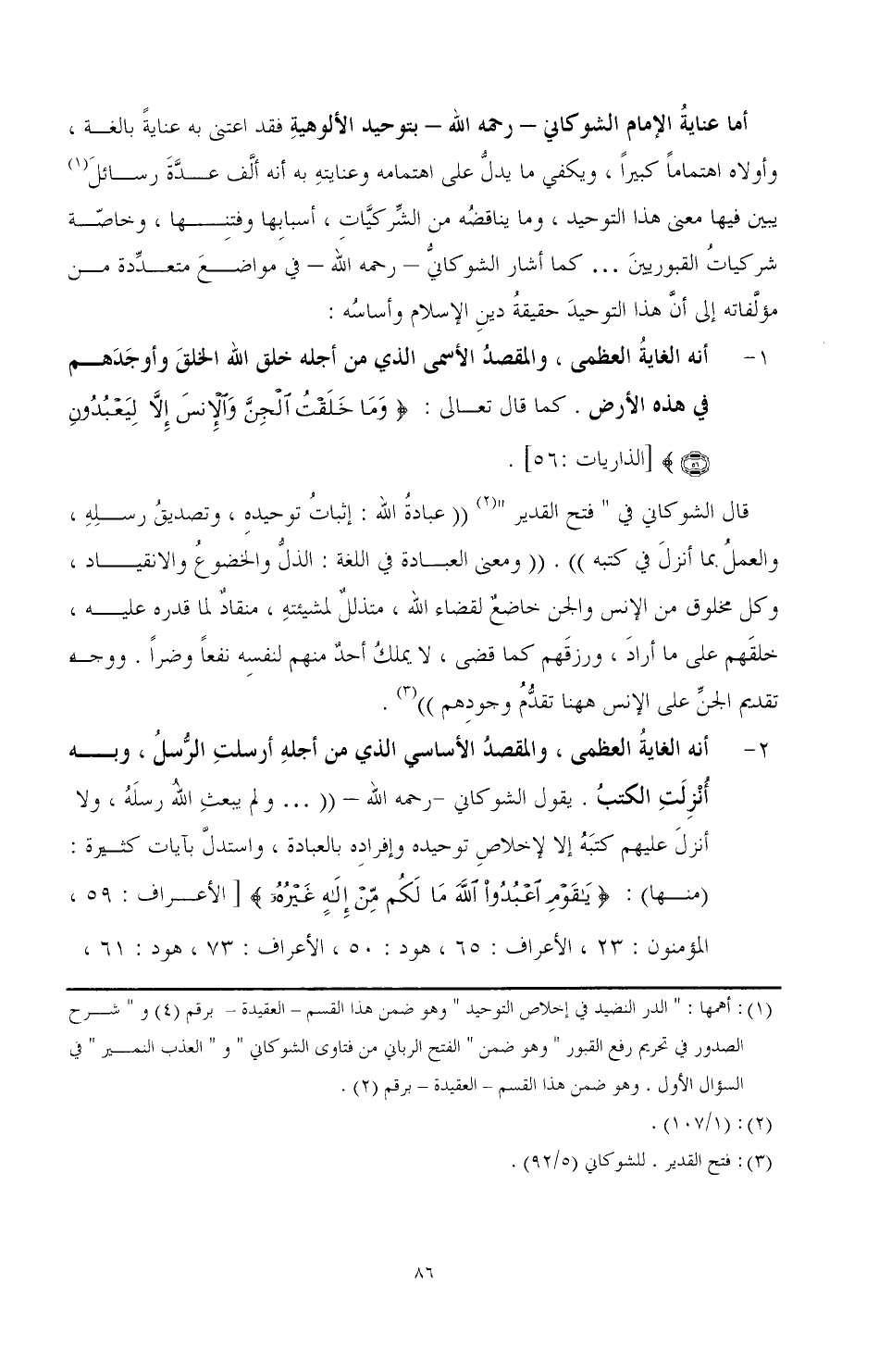 أما عناية الإمام الشوكاني- رحمه الله- بتوحيد الألوهية فقد اعتنى به عناية بالغة، وأولاه اهتماما كبيرا، ويكفي ما يدل على اهتمامه وعنايته به أنه ألف عدة رسائل (¬1) يبين فيها معنى هذا التوحيد، وما يناقضه من الشركيات، أسبابها وفتنها، وخاصة شركيات القبوريين ... كما أشار الشوكاني- رحمه الله- في مواضع متعددة من مؤلفاته إلى أن هذا التوحيد حقيقة دين الإسلام وأساسه:
