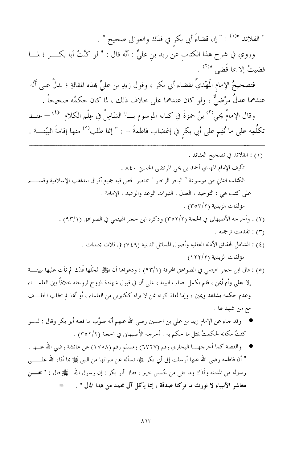 - وإني والله لا أغير شيئا من صدقة رسول الله صَلَّى اللهُ عَلَيْهِ وَسَلَّمَ عن حالها التي كانت عليها في عهد رسول الله! ولأعملن فيها. بما عمل رسول الله صَلَّى اللهُ عَلَيْهِ وَسَلَّمَ ". فأبى أبو بكر أن يدفع إلي فاطمة منها شيئا، فوجدت فاطمة على أبي بكر ذلك فهجرته فلم تكلمه حتى توفيت. وعاشت بعد النبي صَلَّى اللهُ عَلَيْهِ وَسَلَّمَ ستة أشهر ....