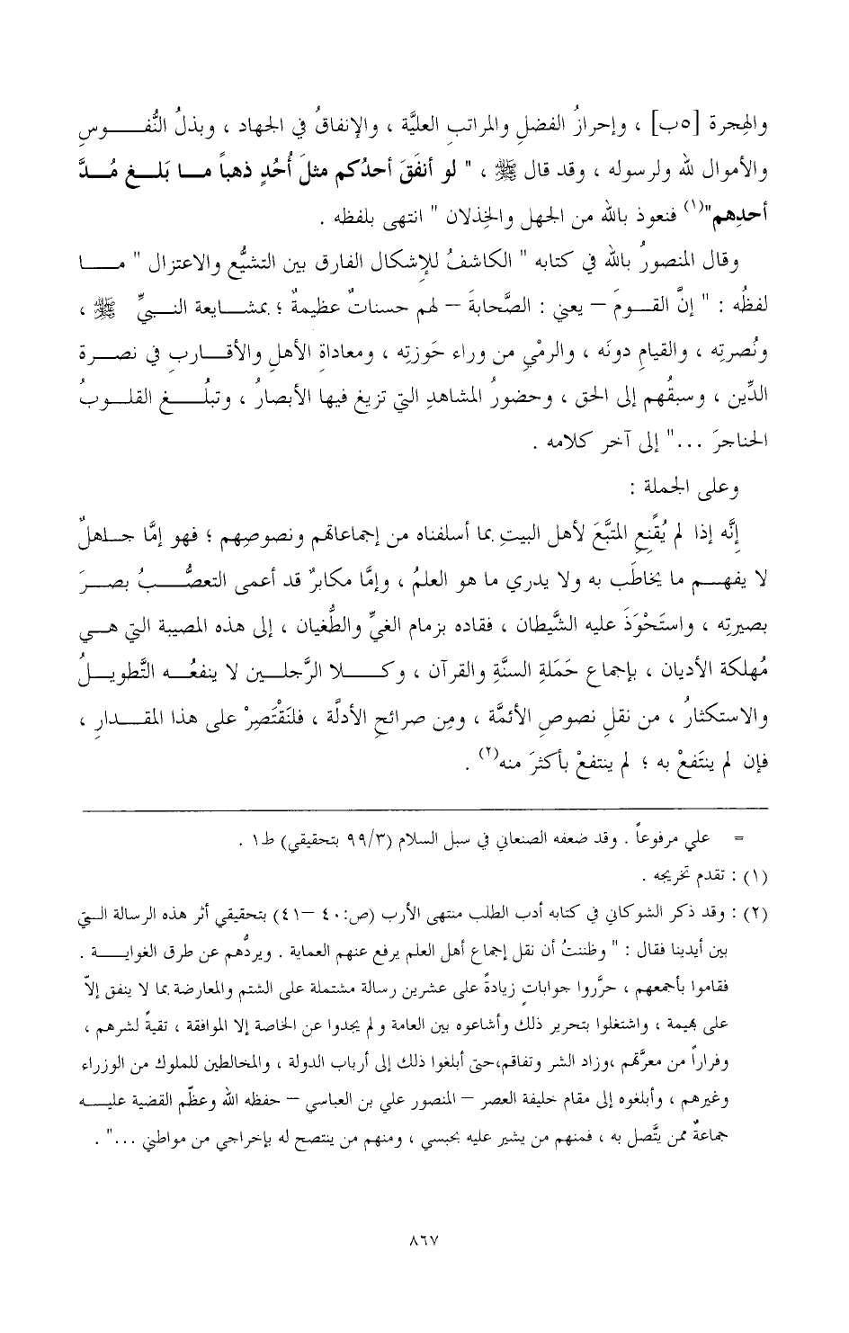(¬2) وقد ذكر الشوكاني في كتابه أدب الطلب منتهى الأرب (ص: 40 - 41) بتحقيقي أثر هذه الرسالة التي بين أيدينا فقال: " وظننت أن نقل إجماع أهل العلم يرفع عنهم العماية. ويردهم عن طرق الغواية. فقاموا بأجمعهم، حرروا جوابات زيادة على عشرين رسالة مشتملة على الشتم والمعارضة. مما لا ينفق إلا على بهيمة، واشتغلوا بتحرير ذلك وأشاعوه بين العامة ولم يجدوا عن الخاصة إلا الموافقة، تقية لشرهم، وفرارا من معرتهم، وزاد الشر وتفاقم، حتى أبلغوا ذلك إلي أرباب الدولة، والمخالطين للملوك من الوزراء وغيرهم، وأبلغوه إلي مقام خليفة العصر- المنصور على بن العباسي- حفظه الله وعظم القضية عليه جمعة ممن يتصل به، فمنهم من يشير عليه بحبسي، ومنهم من ينتصح له بإخراجي من مواطن ... ".