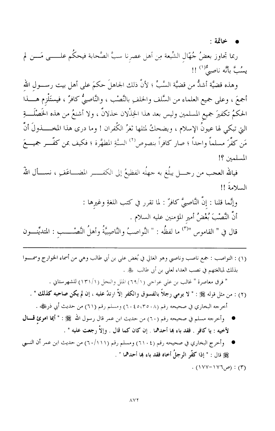 (¬1) النواصب: جمع ناصب وناصبي وهو الغالي في بغض على بن أبي طالب وهي من أسماء الخوارج وعوا بذلك لمبالغتهم في نصب العداء لعلي بن أبي طالب رضي الله عنه. "