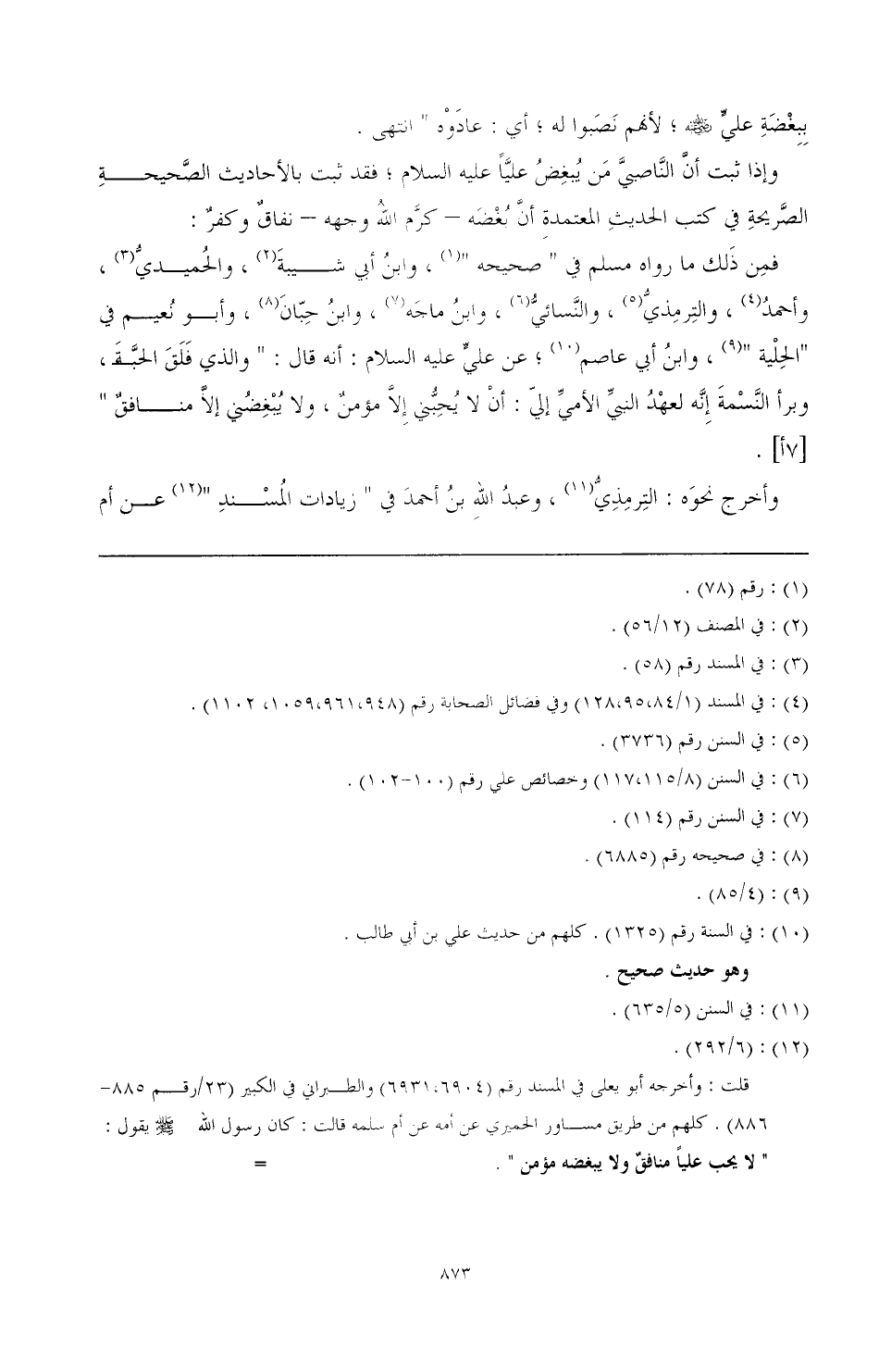 (¬12) (6/ 292). قلت: وأخرجه أبو يعلى في المسند رقم (6931,6904) والطبراني في الكبير (23/ رقم 885 - 886). كلهم من طريق مساور الحميري عن أمه عن أم سلمه قالت: كان رسول الله صَلَّى اللهُ عَلَيْهِ وَسَلَّمَ يقول: " لا يحب عليا منافق ولا يبغضه مؤمن بسند ضعيف لجهالة مساور وأمه لكن الحديث صحيح لغيره."