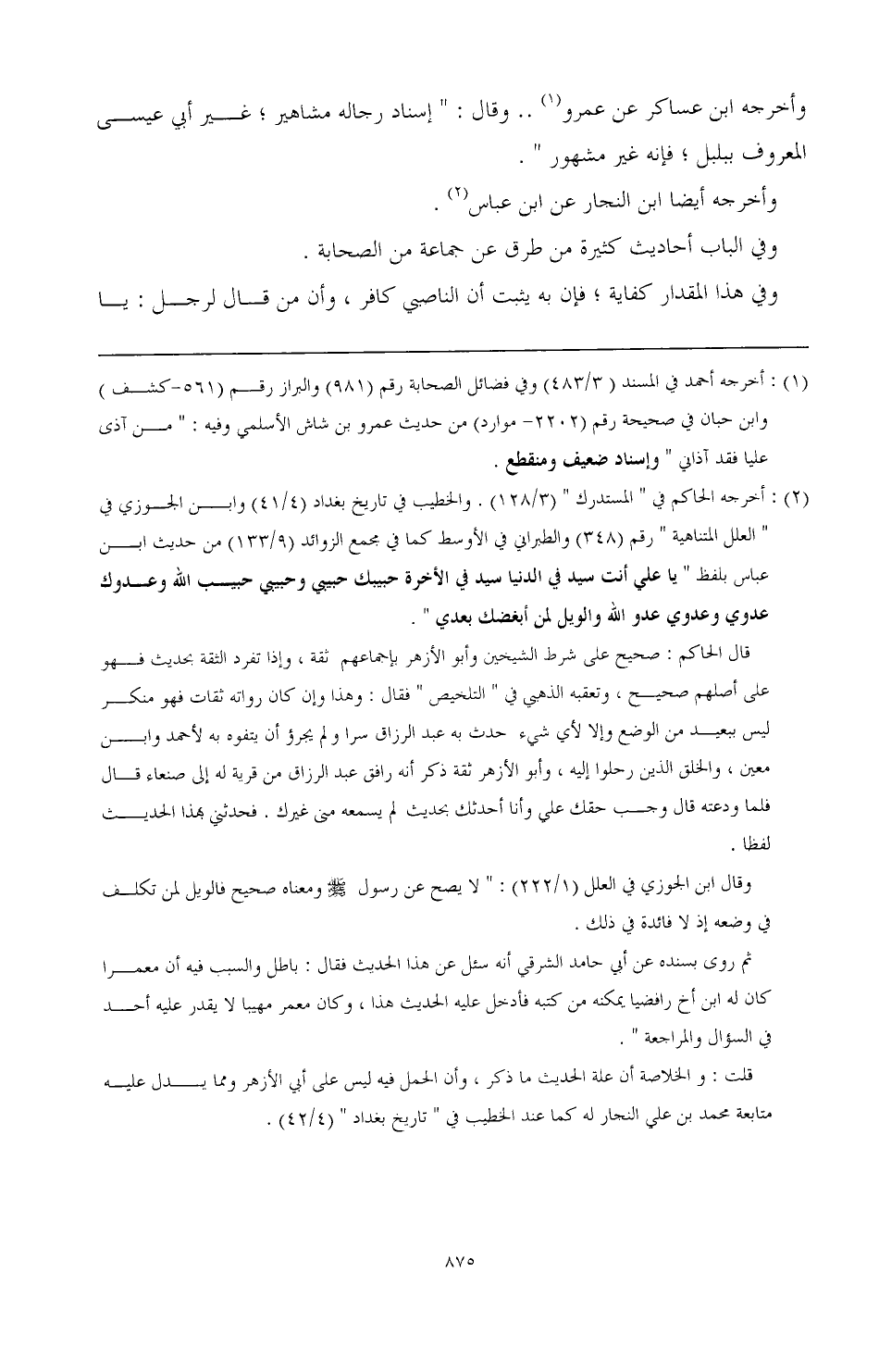 قال الحاكم: صحيح على شرط الشيخين وأبو الأزهر بإجماعهم ثقة، وإذا تفرد الثقة بحديث فهو على أصلهم صحيح، وتعقبه الذهبي في " التلخيص " فقال: وهذا وإن كان رواته ثقات فهو منكر ليس ببعيد من الوضع وإلا لأي شيء حدث به عبد الرزاق سرا ولم يجرؤ أن يتفوه به لأحمد وابن معين، والخلق الذين رحلوا إليه، وأبو الأزهر ثقة ذكر انه رافق عبد الرزاق من قرية له إلي صنعاء قال فلما ودعته قال وجب حقك علي وأنا أحدثك بحديث لم يسمعه مني غيرك. فحدثني بهذا الحديث لفظا.
