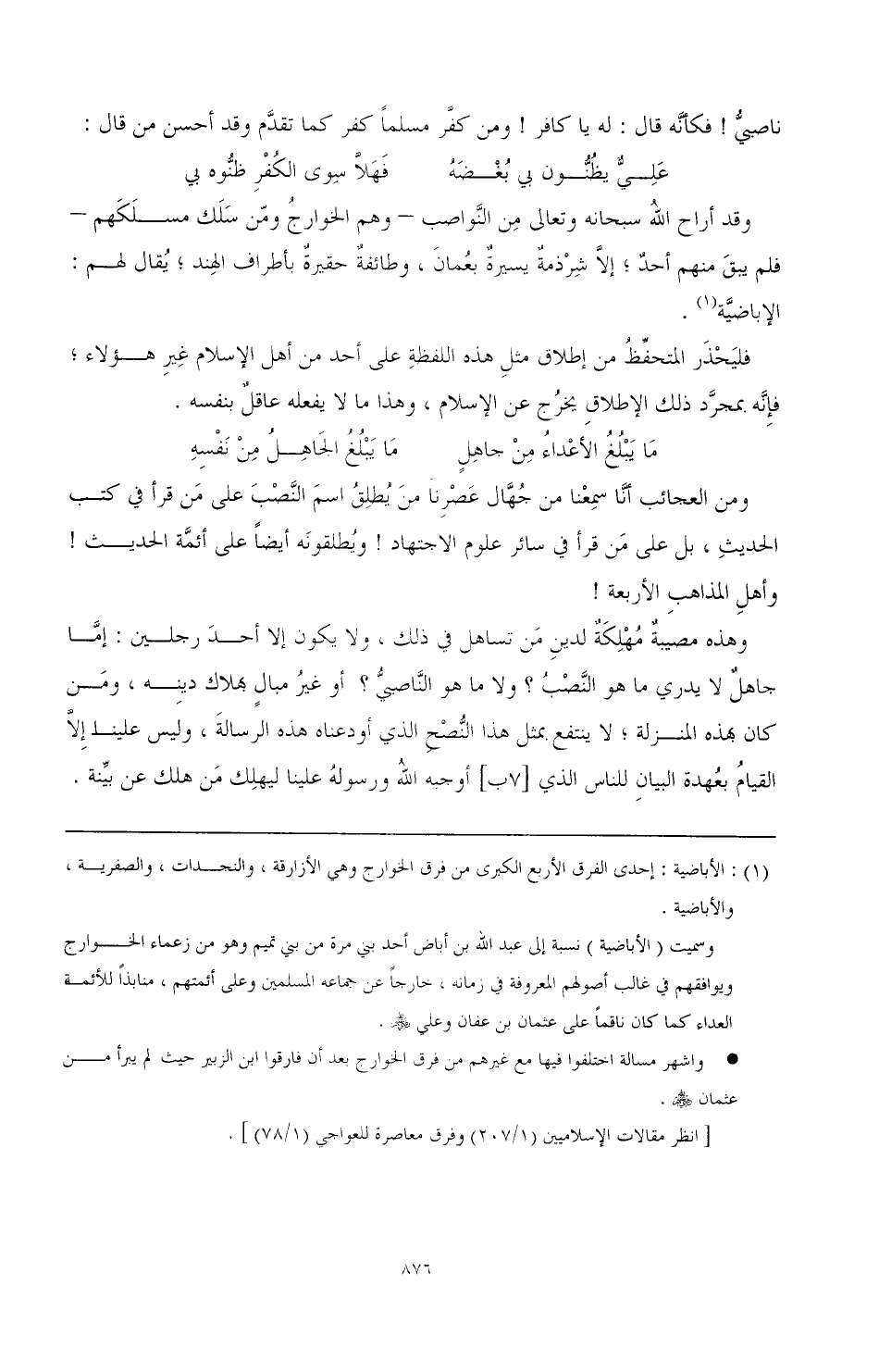 وقد أراح الله سبحانه وتعالي من النواصب - وهم الخوارج ومن سلك مسلكهم - فلم يبق منهم أحد، إلا شرذمة يسيرة بعمان، وطائفة حقيرة بأطراف آلهند؟ يقال لهم: الإباضية (¬1). فليحذر المتحفظ من إطلاق مثل هذه اللفظة على أحد من أهل الإسلام غير هؤلاء؟ فإنه. بمجرد ذلك الإطلاق يخرج عن الإسلام، وهذا ما لا يفعله عاقل بنفسه.