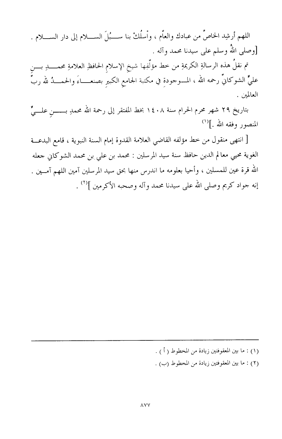 تم نقل هذه الرسالة الكريمة من خط مؤلفها شيخ الإسلام الحافظ العلامة محمد بن علي الشوكاني رحمه الله، الموجودة في مكتبه الجامع الكبير بصنعاء والحمد لله رب العالمين.