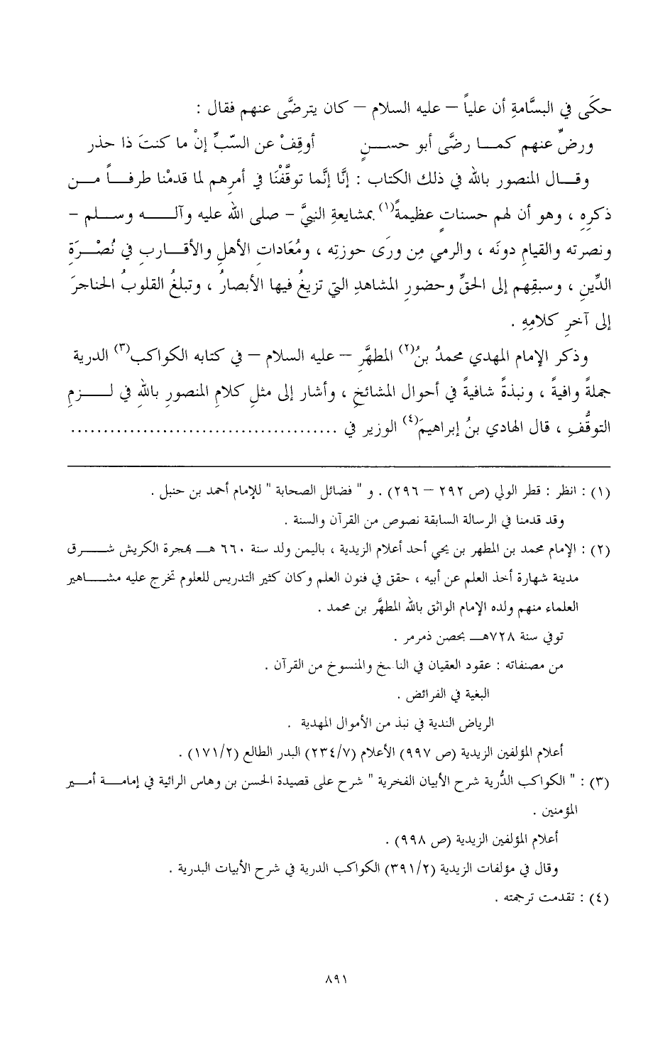 وذكر الإمام المهدي محمد بن (¬2) المطهر- عليه السلام- في كتابه الكواكب (¬3) الدرية جلة وافية، ونبذة شافية في أحوال المشائخ، وأشار إلي مثل كلام المنصور بالله في لزم التوقف، قال الهادي بن إبراهيم (¬4) الوزير في ...................................
