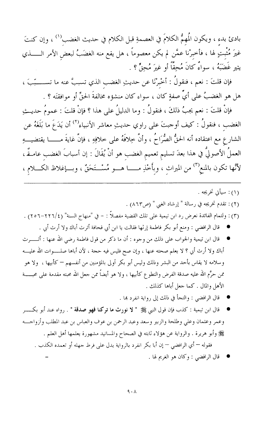 (¬3) ولتمام الفائدة نعرض رد ابن تيمية على تلك التيضية مفصلا:- في "منهاج السنة" (4/ 226 - 256). قال الرافضي: ومنع أبو بكر فاطمة إرثها فقالت يا ابن أبي قحافة أترث أباك ولا أرث أبي.