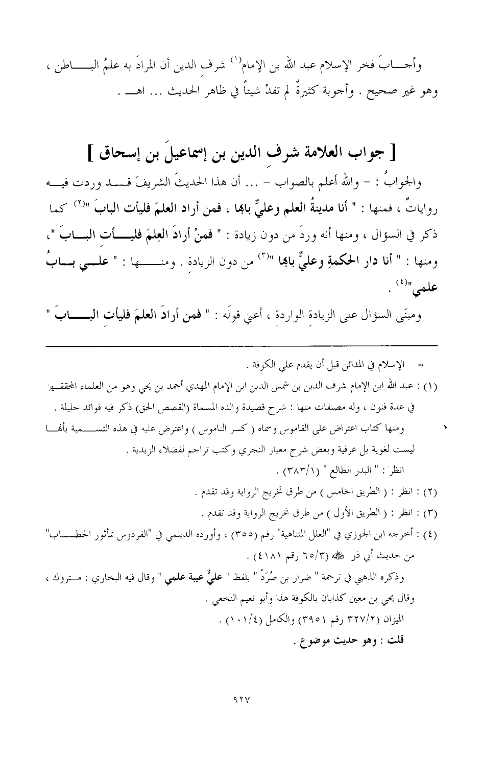 وأجاب فخر الإسلام عبد الله بن الإمام (¬1) شرف الدين أن المراد به علم الباطن، وهو غير صحيح. وأجوبة كثيرة لم تفد شيئا في ظاهر الحديث ... اهـ. أ جواب العلامة لأشرف الدين بن إسماعيل بن إسحاق