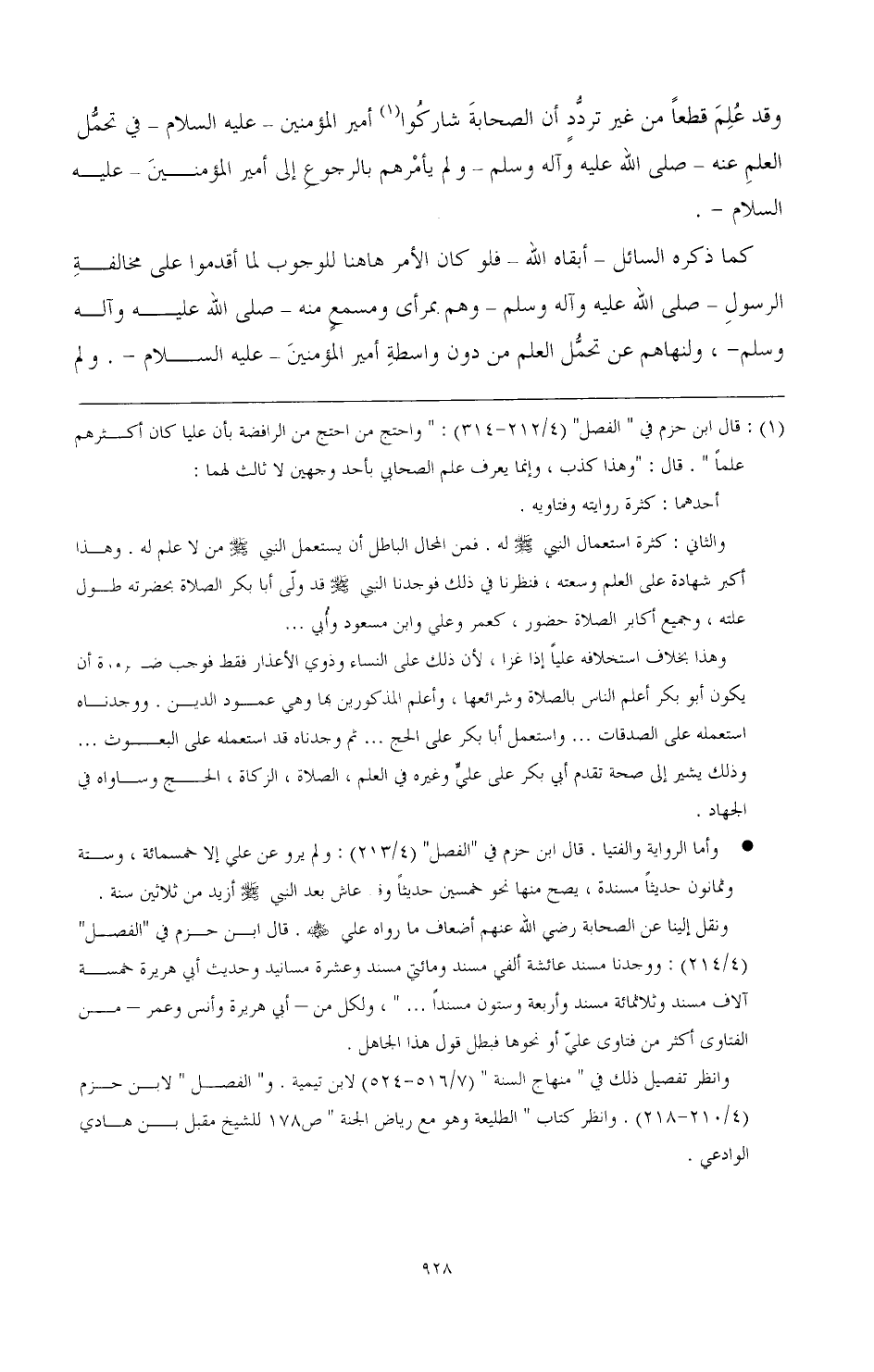 (¬1) قال ابن حزم في " الفصل " (4/ 212 - 314): " واحتج من احتج من الرافضة بأن عليا كان أكثرهم علما ". قال: "وهذا كذب، وإنما يعرف علم الصحابي بأحد وجهين لا ثالث لهما: أحدهما: كثرة روايته وفتاويه.