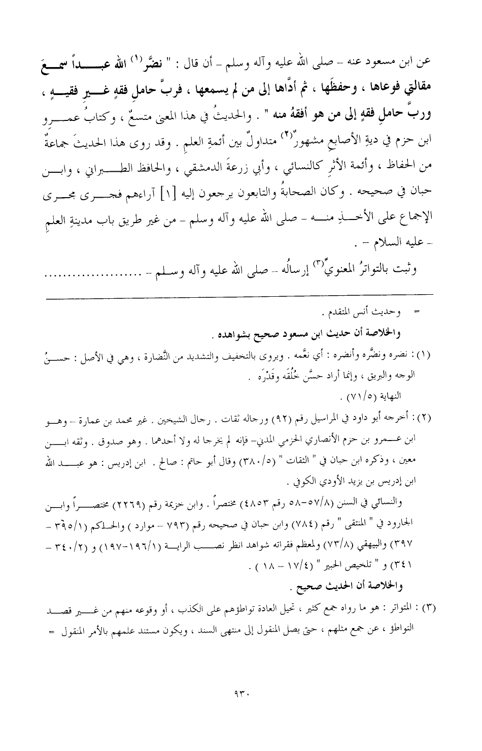 عن ابن مسعود عنه- صَلَّى اللهُ عَلَيْهِ وَآلِهِ وَسَلَّمَ- أن قال: " نضر (¬1) الله عبدا سمع مقالتي فوعاها، وحفظها، ثم أذاها إلي من لم يسمعها، فرب حامل فقه يخر ففيه، ورب حامل فقه إلي من هو أفقه منه ". والحديث في هذا المعنى متسع، وكتاب عمرو ابن حزم في دية الأصابع مشهور (¬2) متداول بين أئمة العلم. وقد روى هذا الحديث جماعة من الحفاظ، وأئمة الأثر كالنسائي، وأبي زرعة الدمشقي، والحافظ الطبراني، وابن حبان في صحيحه. وكان الصحابة والتابعون يرجعون إليه [1] آراءهم فجرى مجرى الإجماع على الأخذ منه - صَلَّى اللهُ عَلَيْهِ وَآلِهِ وَسَلَّمَ - من غير طريق باب مدينة العلم - عليه السلام -.