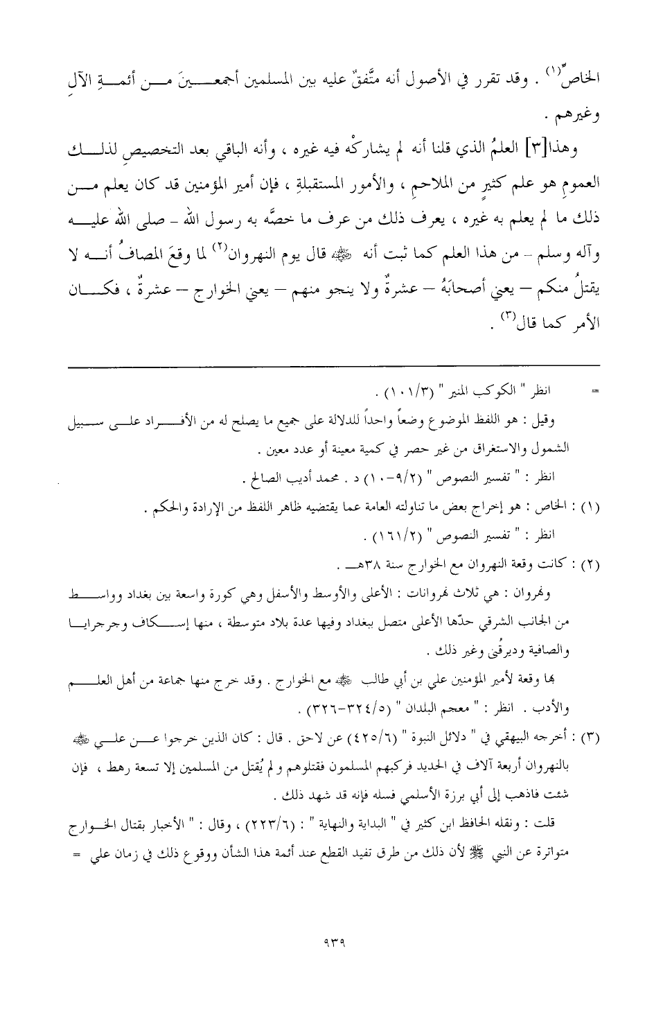وهذا [3] العلم الذي قلنا أنه لم يشاركه فيه غيره، وأنه الباقي بعد التخصيص لذلك العموم هو علم كثير من الملاحم، والأمور المستقبلة، فإن أمير المؤمنين قد كان يعلم من ذلك ما لم يعلم به غيره، يعرف ذلك من عرف ما خصه به رسول الله - صَلَّى اللهُ عَلَيْهِ وَآلِهِ وَسَلَّمَ- من هذا العلم كما ثبت أنه رضي الله عنه قال يوم النهروان (¬2) لما وقع المصاف أنه لا يقتل منكم - يعني أصحابه - عشرة ولا ينجو منهم - يعني الخوارج - عشرة، فكان الأمير كما قال (¬3).
