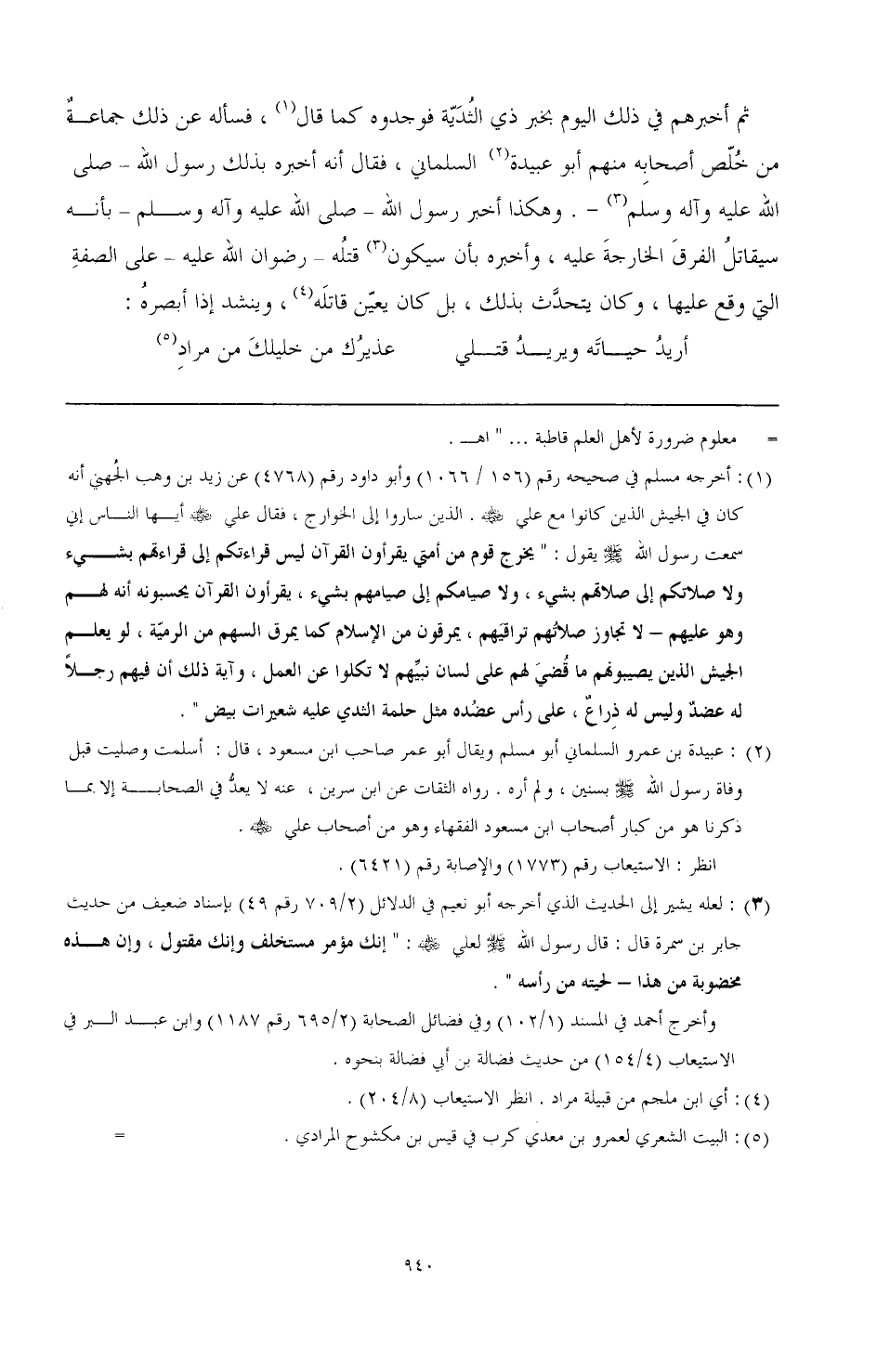 ثم أخبرهم في ذلك اليوم بخبر ذي الثدية فوجدوه كما قال (¬1)، فسآله عن ذلك جماعة من خلص أصحابه منهم أبو عبيدة (¬2) السلماني، فقال أنه أخبره بذلك رسول الله - صَلَّى اللهُ عَلَيْهِ وَآلِهِ وَسَلَّمَ (3) -. وهكذا أخبر رسول الله - صَلَّى اللهُ عَلَيْهِ وَآلِهِ وَسَلَّمَ - بأنه سيقاتل الفرق الخارجة عليه، وأخبره بأن سيكون (¬3) قتله - رضوان الله عليه - على الصفة التي وقع عليها، وكان يتحدث بذلك، بل كان يعين قاتله (¬4)، وينشد إذا أبصره: