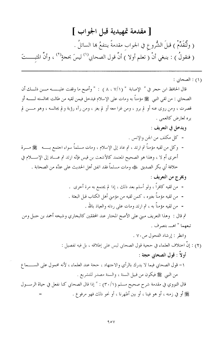 (¬1) الصحابي: قال الحافظ ابن حجر في " الإصابة " (1/ 7 , 8): " وأصح ما وقفت عليه من دلك أن الصحابي: من لقط النبي صَلَّى اللهُ عَلَيْهِ وَسَلَّمَ مؤمنا به ومات على الإسلام فيدخل فيمن لفيه من طالت مجالسته له أو قصرت، ومن روى عنه أو لم يرو، ومن غزا معه أو لم يغز، ومن رآه رؤبة ولم يجالسه، وهو من لم يره لعارض كالعمى.