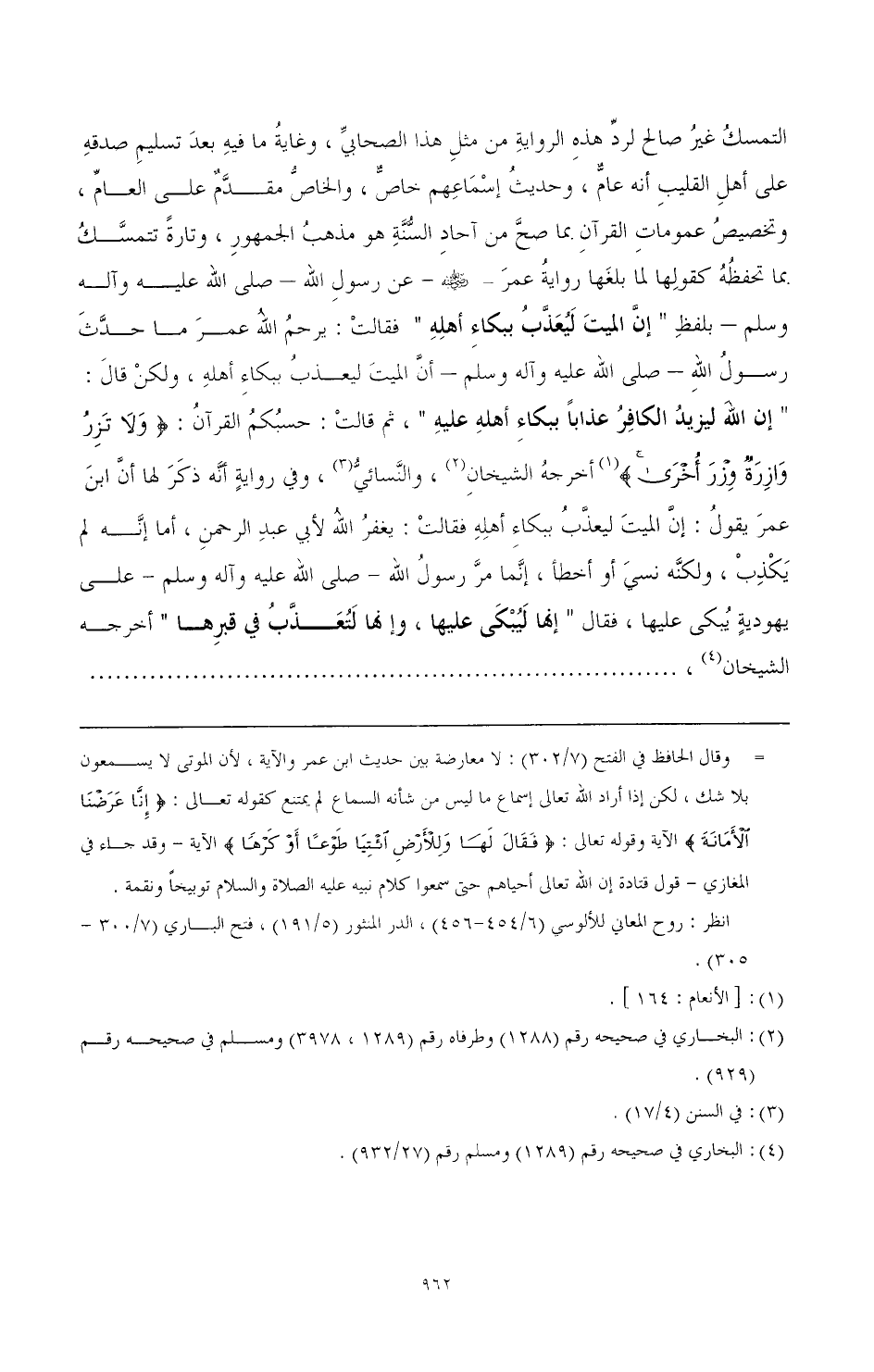 التمسك غير صالح لرد هذه الرواية من مثل هذا الصحابي، وغاية ما فيه بعد تسليم صدقه على أهل القليب أنه عام، وحديث إسماعهم خاص، والخاص مقحم على العام، وتخصيص عمومات القرآن. مما صح من آحاد السمنة هو مذهب الجمهور، وتارة تتمسك بما حفظة كقولها لما بلغها رواية عمر - رضي الله عنه - عن رسول الله - صَلَّى اللهُ عَلَيْهِ وَآلِهِ وَسَلَّمَ - بلفظ " إن الميت ليعذب ببكاء أهله " قالت: يرحم الله عمر ها حاث رسول الله - صَلَّى اللهُ عَلَيْهِ وَآلِهِ وَسَلَّمَ - أن الميت ليعذب ببكاء أهله، ولكن قال: " إن الله ليزيد الكافر عذابا ببكاء أهله عليه "، ثم قالت: حسبكم القرآن: {وَلَا تَزِرُ وَازِرَةٌ وِزْرَ أُخْرَى} (¬1) أخرجه الشيخان (¬2)، والنسائي (¬3)، وفي رواية أنه ذكر لها أن ابن عمر يقول: إن الميت ليعذب ببكاء أهله فقالت: يغفر الله لأبي عبد الرحمن، أما إنه لم يكذب، ولكنه نسط أو أخطأ، إنما مر رسول الله - صَلَّى اللهُ عَلَيْهِ وَآلِهِ وَسَلَّمَ - على يهودية يبكى عليها، فقال " إنها ليبكى عليها، وإنها لتعذب في قبرها " أخرجه الشيخان (¬4)،. . . . . . . . . . . . . . . . . . . . .