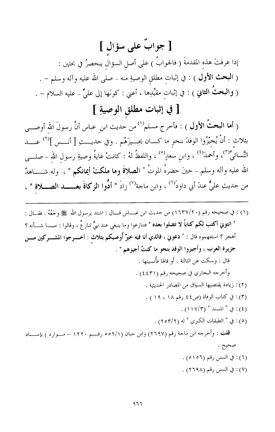 (أما البحث الأول): فأخرج مسلم (¬1) من حديث ابن عباس أن رسول الله أوصى بثلاث: أن يجيزوا الوفد بنحو ما كان يجيزهم. وفي حديث [أنس] (¬2) عند النسائي (¬3)، وأحمد (¬4)، وابن سعد (¬5)، واللفظ له: كانت غاية وصية رسول الله - صَلَّى اللهُ عَلَيْهِ وَآلِهِ وَسَلَّمَ - حين حضره الموت " الصلاة وما ملكت أيمانكم "، وله شاهد من حديث على عند أبي داود (¬6)، وابن ماجة (¬7) زاد " أدوا الزكاة بعد الصلاة"،